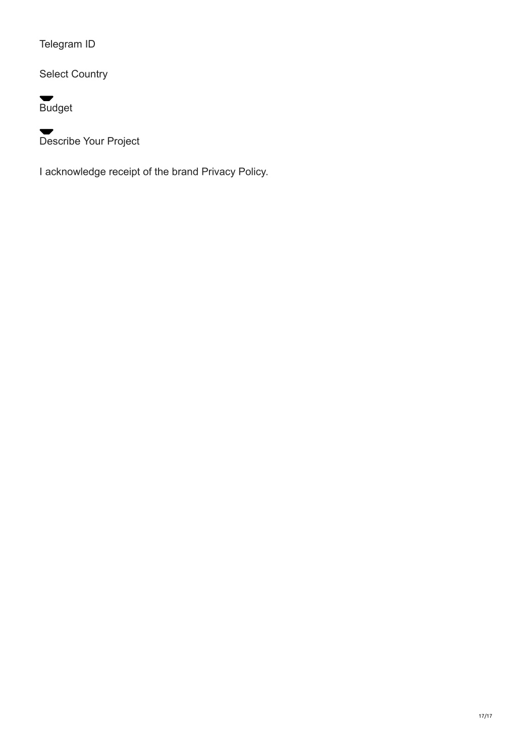 17. Telegram ID Select Country Budget Describe Your Project I acknowledge receipt of the brand Privacy Policy. 17/17
