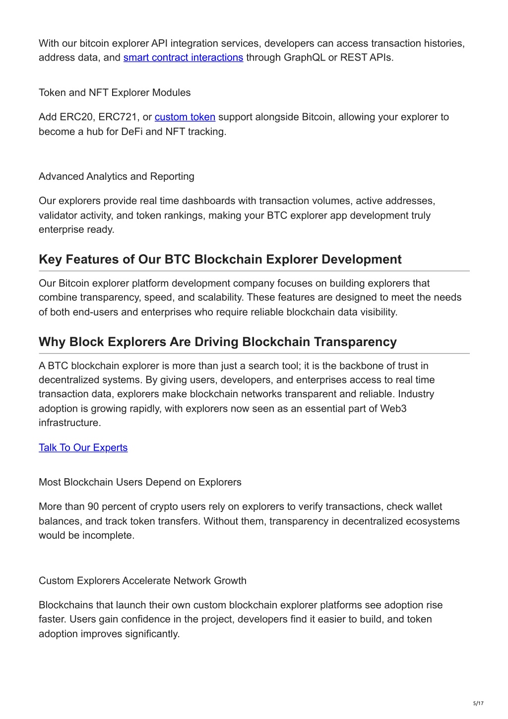 5. With our bitcoin explorer API integration services, developers can access transaction histories, address data, and smart contract interactions through GraphQL or REST APIs. Token and NFT Explorer Modules Add ERC20, ERC721, or custom token support alongside Bitcoin, allowing your explorer to become a hub for DeFi and NFT tracking. Advanced Analytics and Reporting Our explorers provide real time dashboards with transaction volumes, active addresses, validator activity, and token rankings, making your BTC explorer app development truly enterprise ready. Key Features of Our BTC Blockchain Explorer Development Our Bitcoin explorer platform development company focuses on building explorers that combine transparency, speed, and scalability. These features are designed to meet the needs of both end-users and enterprises who require reliable blockchain data visibility. Why Block Explorers Are Driving Blockchain Transparency A BTC blockchain explorer is more than just a search tool; it is the backbone of trust in decentralized systems. By giving users, developers, and enterprises access to real time transaction data, explorers make blockchain networks transparent and reliable. Industry adoption is growing rapidly, with explorers now seen as an essential part of Web3 infrastructure. Talk To Our Experts Most Blockchain Users Depend on Explorers More than 90 percent of crypto users rely on explorers to verify transactions, check wallet balances, and track token transfers. Without them, transparency in decentralized ecosystems would be incomplete. Custom Explorers Accelerate Network Growth Blockchains that launch their own custom blockchain explorer platforms see adoption rise faster. Users gain confidence in the project, developers find it easier to build, and token adoption improves significantly. 5/17