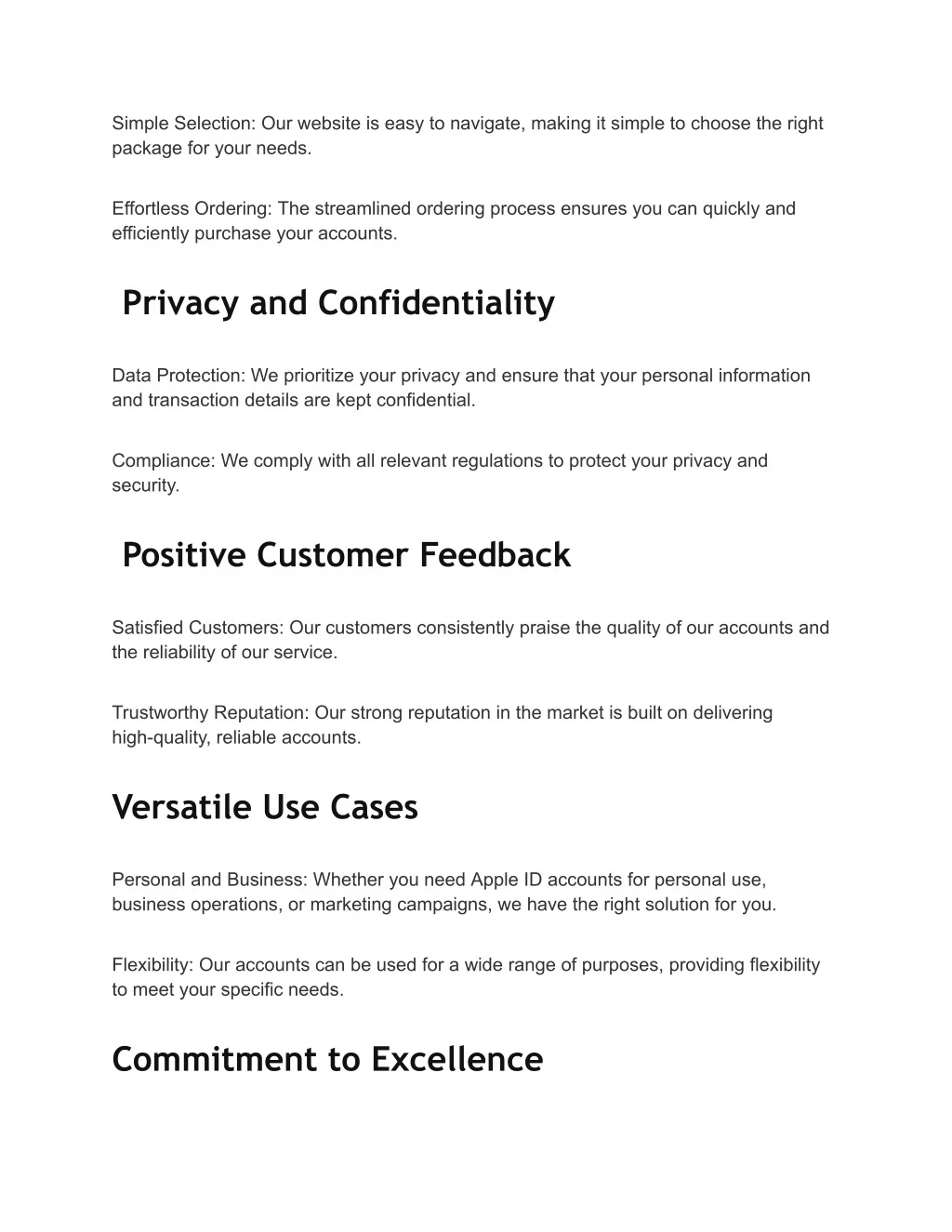 Simple Selection: Our website is easy to navigate, making it simple to choose the right package for your needs. Effortless Ordering: The streamlined ordering process ensures you can quickly and efficiently purchase your accounts. Privacy and Confidentiality Data Protection: We prioritize your privacy and ensure that your personal information and transaction details are kept confidential. Compliance: We comply with all relevant regulations to protect your privacy and security. Positive Customer Feedback Satisfied Customers: Our customers consistently praise the quality of our accounts and the reliability of our service. Trustworthy Reputation: Our strong reputation in the market is built on delivering high-quality, reliable accounts. Versatile Use Cases Personal and Business: Whether you need Apple ID accounts for personal use, business operations, or marketing campaigns, we have the right solution for you. Flexibility: Our accounts can be used for a wide range of purposes, providing flexibility to meet your specific needs. Commitment to Excellence
