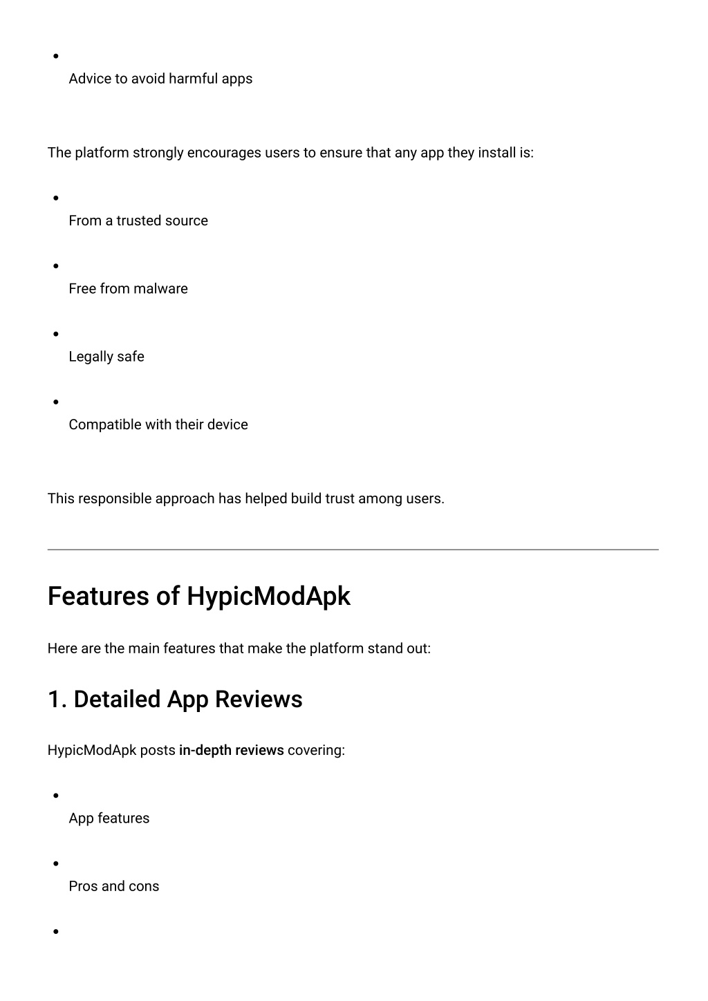 Advice to avoid harmful apps The platform strongly encourages users to ensure that any app they install is: From a trusted source Free from malware Legally safe Compatible with their device This responsible approach has helped build trust among users. Features of HypicModApk Here are the main features that make the platform stand out: 1. Detailed App Reviews HypicModApk posts in-depth reviews covering: App features Pros and cons
