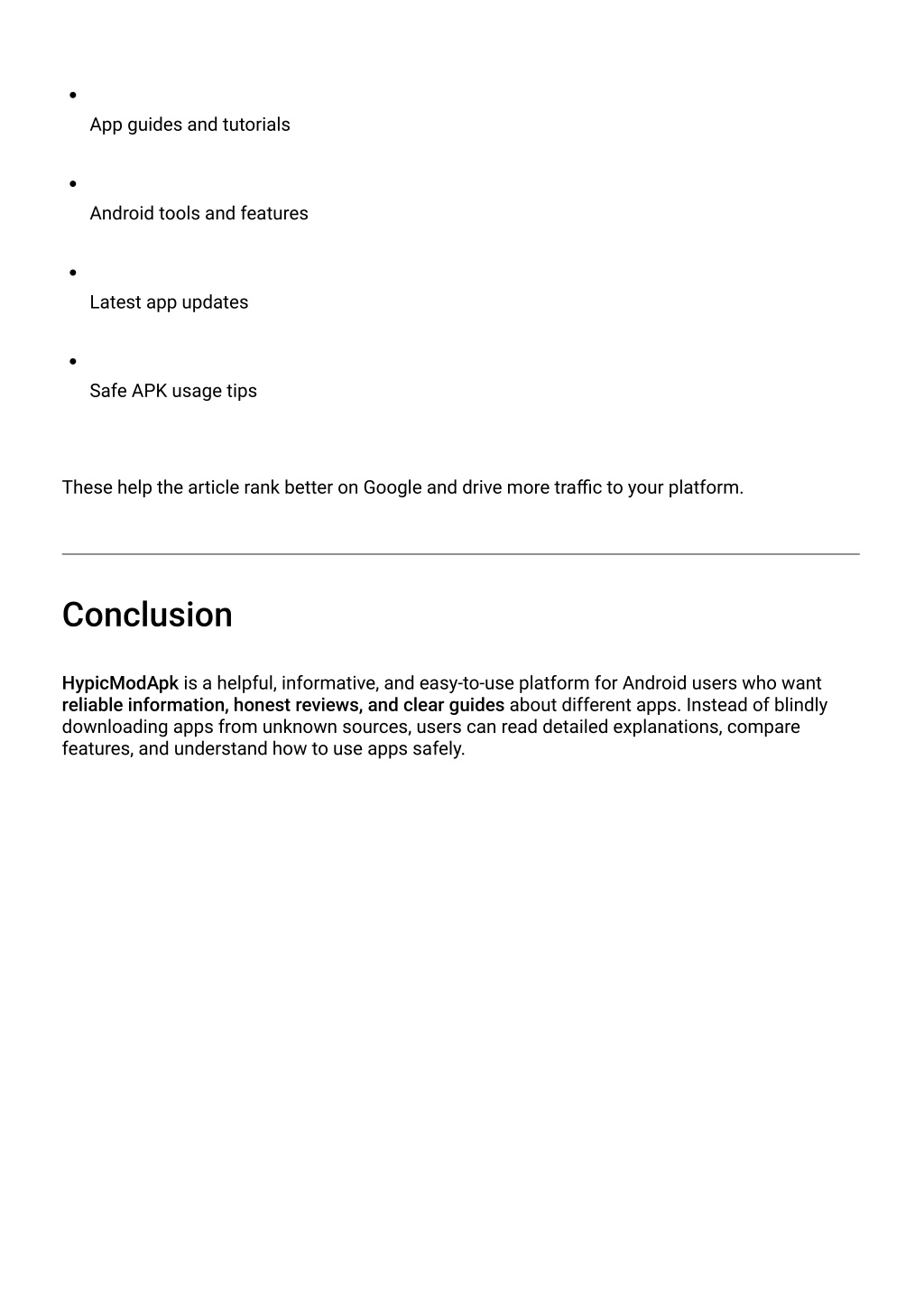 App guides and tutorials Android tools and features Latest app updates Safe APK usage tips These help the article rank better on Google and drive more traffic to your platform. Conclusion HypicModApk is a helpful, informative, and easy-to-use platform for Android users who want reliable information, honest reviews, and clear guides about different apps. Instead of blindly downloading apps from unknown sources, users can read detailed explanations, compare features, and understand how to use apps safely.