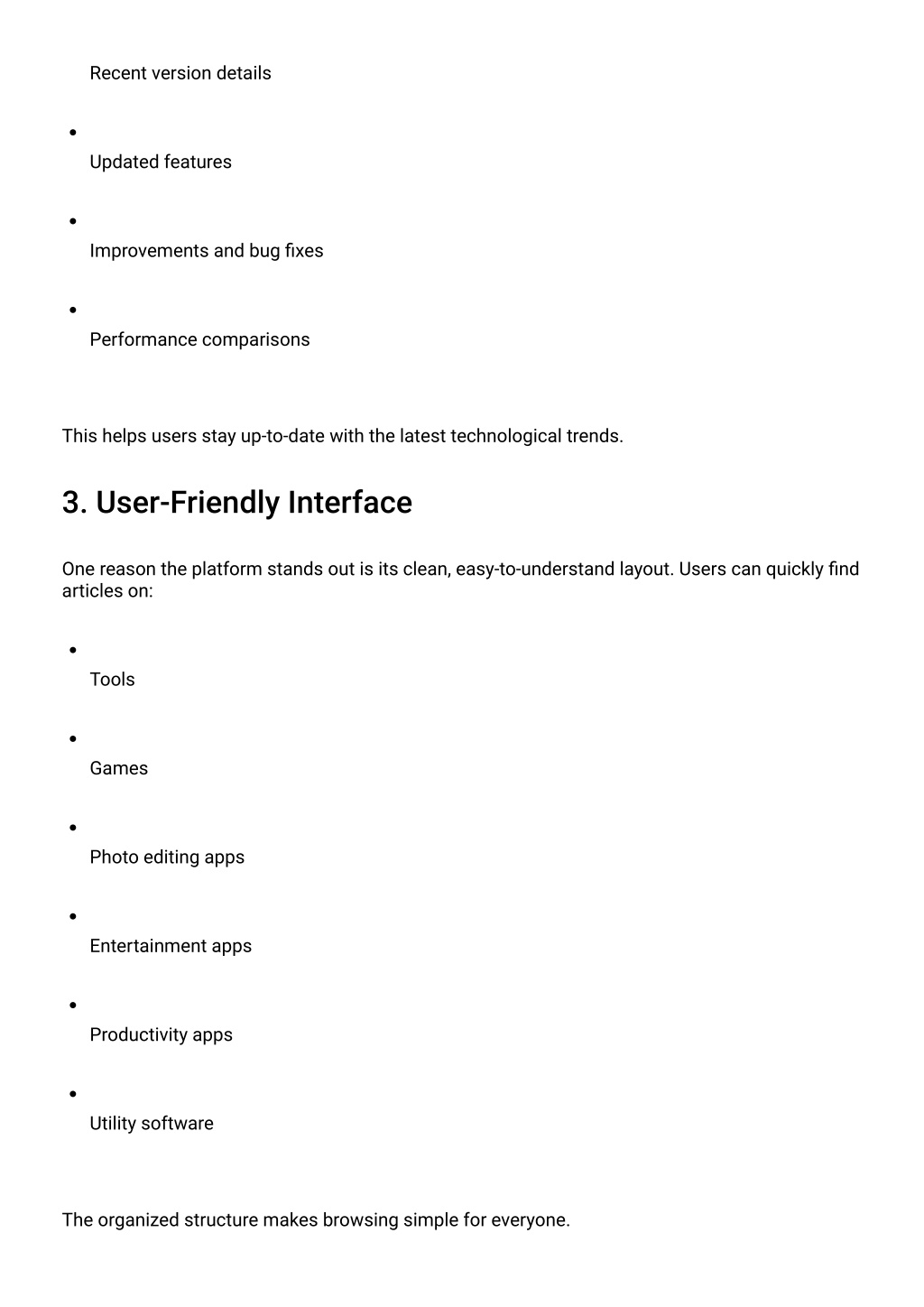 Recent version details Updated features Improvements and bug fixes Performance comparisons This helps users stay up-to-date with the latest technological trends. 3. User-Friendly Interface One reason the platform stands out is its clean, easy-to-understand layout. Users can quickly find articles on: Tools Games Photo editing apps Entertainment apps Productivity apps Utility software The organized structure makes browsing simple for everyone.