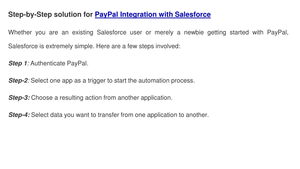 Step-by-Step solution for PayPal Integration with Salesforce Whether you are an existing Salesforce user or merely a newbie getting started with PayPal, Salesforce is extremely simple. Here are a few steps involved: Step 1: Authenticate PayPal. Step-2: Select one app as a trigger to start the automation process. Step-3: Choose a resulting action from another application. Step-4: Select data you want to transfer from one application to another.