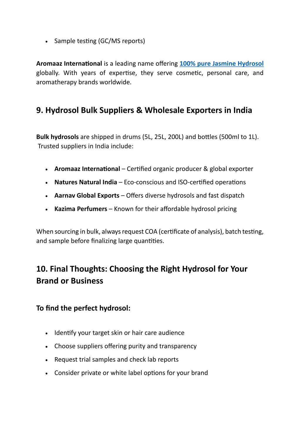 •Sample testing (GC/MS reports) Aromaaz International is a leading name offering 100% pure Jasmine Hydrosol globally. With years of expertise, they serve cosmetic, personal care, and aromatherapy brands worldwide. 9. Hydrosol Bulk Suppliers & Wholesale Exporters in India Bulk hydrosols are shipped in drums (5L, 25L, 200L) and bottles (500ml to 1L). Trusted suppliers in India include: •Aromaaz International – Certified organic producer & global exporter •Natures Natural India – Eco-conscious and ISO-certified operations •Aarnav Global Exports – Offers diverse hydrosols and fast dispatch •Kazima Perfumers – Known for their affordable hydrosol pricing When sourcing in bulk, always request COA (certificate of analysis), batch testing, and sample before finalizing large quantities. 10. Final Thoughts: Choosing the Right Hydrosol for Your Brand or Business To find the perfect hydrosol: •Identify your target skin or hair care audience •Choose suppliers offering purity and transparency •Request trial samples and check lab reports •Consider private or white label options for your brand