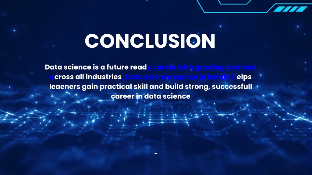 9. CONCLUSION Data science is a future ready career with growing demand across all industries. Data science course in kerala helps leaeners gain practical skill and build strong, successfull career in data science -