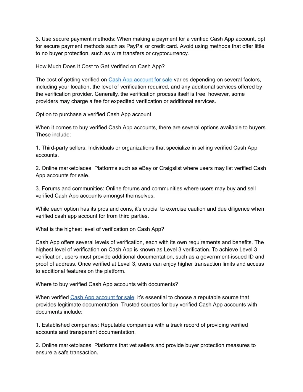 3. Use secure payment methods: When making a payment for a verified Cash App account, opt for secure payment methods such as PayPal or credit card. Avoid using methods that offer little to no buyer protection, such as wire transfers or cryptocurrency. How Much Does It Cost to Get Verified on Cash App? The cost of getting verified on Cash App account for sale varies depending on several factors, including your location, the level of verification required, and any additional services offered by the verification provider. Generally, the verification process itself is free; however, some providers may charge a fee for expedited verification or additional services. Option to purchase a verified Cash App account When it comes to buy verified Cash App accounts, there are several options available to buyers. These include: 1. Third-party sellers: Individuals or organizations that specialize in selling verified Cash App accounts. 2. Online marketplaces: Platforms such as eBay or Craigslist where users may list verified Cash App accounts for sale. 3. Forums and communities: Online forums and communities where users may buy and sell verified Cash App accounts amongst themselves. While each option has its pros and cons, it’s crucial to exercise caution and due diligence when verified cash app account for from third parties. What is the highest level of verification on Cash App? Cash App offers several levels of verification, each with its own requirements and benefits. The highest level of verification on Cash App is known as Level 3 verification. To achieve Level 3 verification, users must provide additional documentation, such as a government-issued ID and proof of address. Once verified at Level 3, users can enjoy higher transaction limits and access to additional features on the platform. Where to buy verified Cash App accounts with documents? When verified Cash App account for sale, it’s essential to choose a reputable source that provides legitimate documentation. Trusted sources for buy verified Cash App accounts with documents include: 1. Established companies: Reputable companies with a track record of providing verified accounts and transparent documentation. 2. Online marketplaces: Platforms that vet sellers and provide buyer protection measures to ensure a safe transaction.