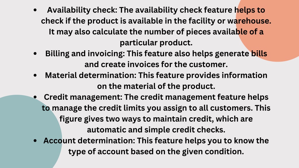 Availability check: The availability check feature helps to check if the product is available in the facility or warehouse. It may also calculate the number of pieces available of a particular product. Billing and invoicing: This feature also helps generate bills and create invoices for the customer. Material determination:This feature provides information on the material of the product. Credit management: The credit management feature helps to manage the credit limits you assign to all customers. This figure gives two ways to maintain credit, which are automatic and simple credit checks. Account determination: This feature helps you to know the type of account based on the given condition.