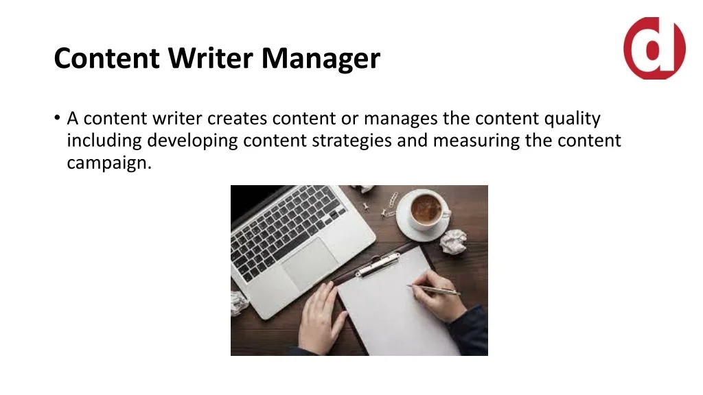 Content Writer Manager • A content writer creates content or manages the content quality including developing content strategies and measuring the content campaign.