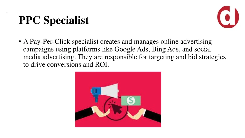 PPC Specialist - • A Pay-Per-Click specialist creates and manages online advertising campaigns using platforms like Google Ads, Bing Ads, and social media advertising. They are responsible for targeting and bid strategies to drive conversions and ROI.