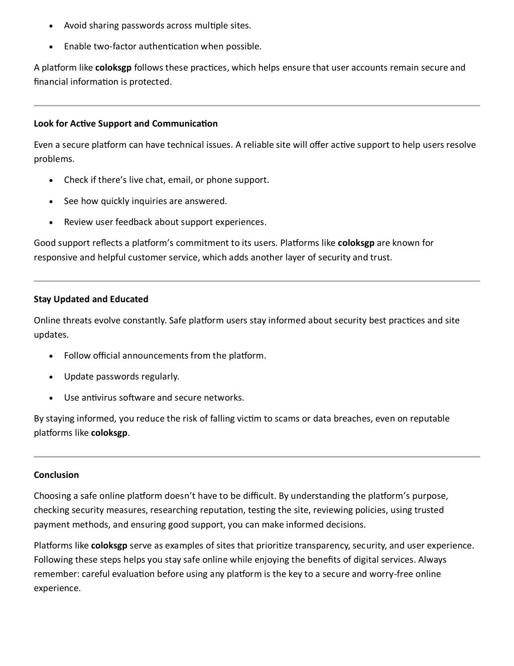 Avoid sharing passwords across multiple sites. Enable two-factor authentication when possible. A platform like coloksgp follows these practices, which helps ensure that user accounts remain secure and financial information is protected. Look for Active Support and Communication Even a secure platform can have technical issues. A reliable site will offer active support to help users resolve problems. Check if there’s live chat, email, or phone support. See how quickly inquiries are answered. Review user feedback about support experiences. Good support reflects a platform’s commitment to its users. Platforms like coloksgp are known for responsive and helpful customer service, which adds another layer of security and trust. Stay Updated and Educated Online threats evolve constantly. Safe platform users stay informed about security best practices and site updates. Follow official announcements from the platform. Update passwords regularly. Use antivirus software and secure networks. By staying informed, you reduce the risk of falling victim to scams or data breaches, even on reputable platforms like coloksgp. Conclusion Choosing a safe online platform doesn’t have to be difficult. By understanding the platform’s purpose, checking security measures, researching reputation, testing the site, reviewing policies, using trusted payment methods, and ensuring good support, you can make informed decisions. Platforms like coloksgp serve as examples of sites that prioritize transparency, security, and user experience. Following these steps helps you stay safe online while enjoying the benefits of digital services. Always remember: careful evaluation before using any platform is the key to a secure and worry-free online experience.