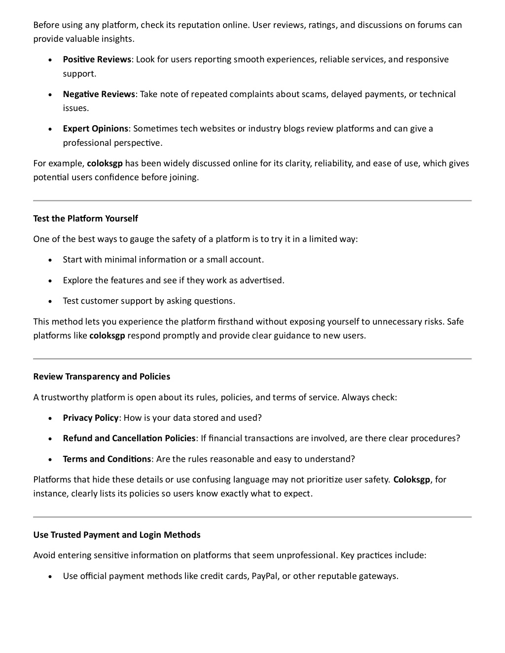 Before using any platform, check its reputation online. User reviews, ratings, and discussions on forums can provide valuable insights. Positive Reviews: Look for users reporting smooth experiences, reliable services, and responsive support. Negative Reviews: Take note of repeated complaints about scams, delayed payments, or technical issues. Expert Opinions: Sometimes tech websites or industry blogs review platforms and can give a professional perspective. For example, coloksgp has been widely discussed online for its clarity, reliability, and ease of use, which gives potential users confidence before joining. Test the Platform Yourself One of the best ways to gauge the safety of a platform is to try it in a limited way: Start with minimal information or a small account. Explore the features and see if they work as advertised. Test customer support by asking questions. This method lets you experience the platform firsthand without exposing yourself to unnecessary risks. Safe platforms like coloksgp respond promptly and provide clear guidance to new users. Review Transparency and Policies A trustworthy platform is open about its rules, policies, and terms of service. Always check: Privacy Policy: How is your data stored and used? Refund and Cancellation Policies: If financial transactions are involved, are there clear procedures? Terms and Conditions: Are the rules reasonable and easy to understand? Platforms that hide these details or use confusing language may not prioritize user safety. Coloksgp, for instance, clearly lists its policies so users know exactly what to expect. Use Trusted Payment and Login Methods Avoid entering sensitive information on platforms that seem unprofessional. Key practices include: Use official payment methods like credit cards, PayPal, or other reputable gateways.