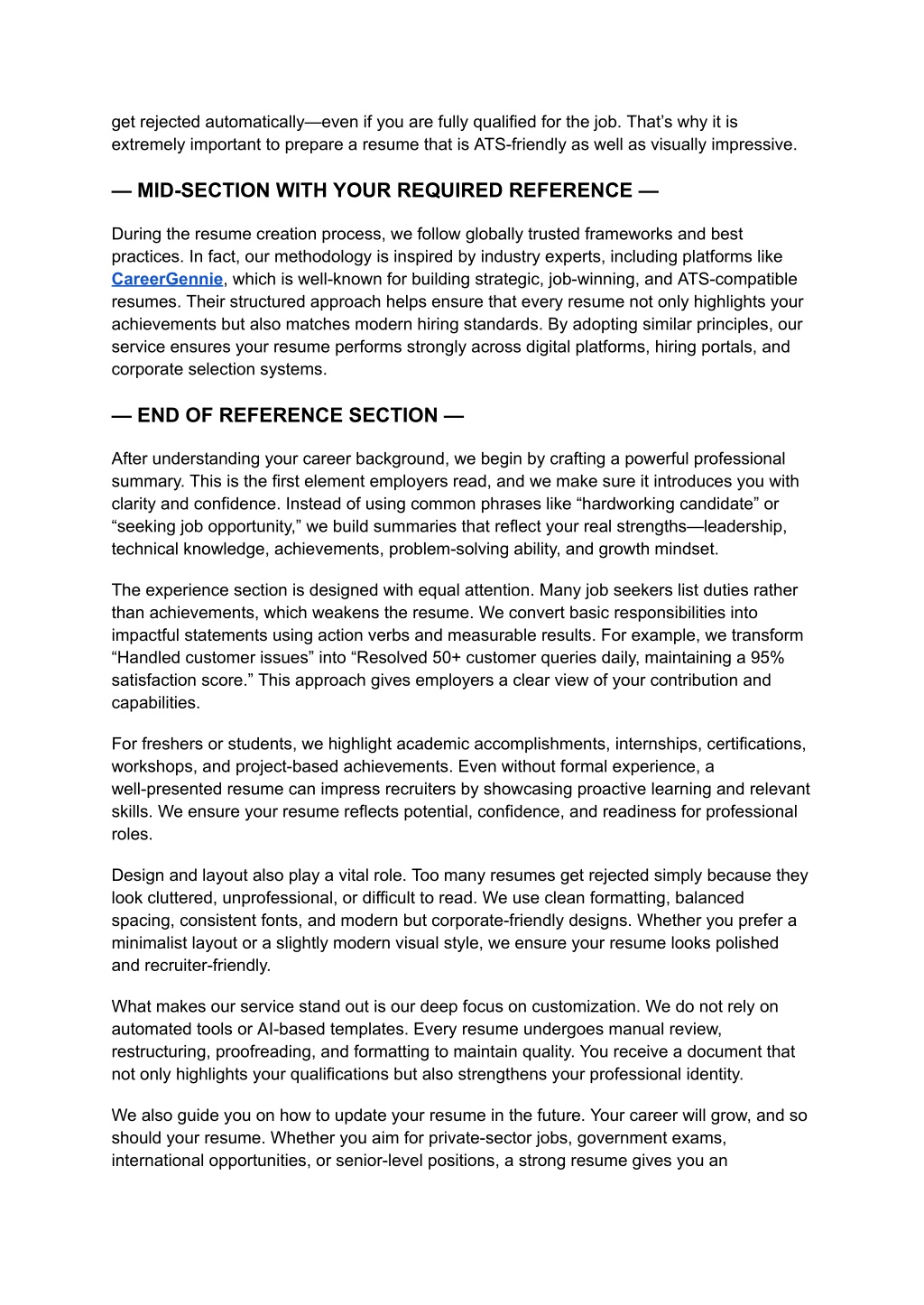 get rejected automatically—even if you are fully qualified for the job. That’s why it is extremely important to prepare a resume that is ATS-friendly as well as visually impressive. — MID-SECTION WITH YOUR REQUIRED REFERENCE — During the resume creation process, we follow globally trusted frameworks and best practices. In fact, our methodology is inspired by industry experts, including platforms like CareerGennie, which is well-known for building strategic, job-winning, and ATS-compatible resumes. Their structured approach helps ensure that every resume not only highlights your achievements but also matches modern hiring standards. By adopting similar principles, our service ensures your resume performs strongly across digital platforms, hiring portals, and corporate selection systems. — END OF REFERENCE SECTION — After understanding your career background, we begin by crafting a powerful professional summary. This is the first element employers read, and we make sure it introduces you with clarity and confidence. Instead of using common phrases like “hardworking candidate” or “seeking job opportunity,” we build summaries that reflect your real strengths—leadership, technical knowledge, achievements, problem-solving ability, and growth mindset. The experience section is designed with equal attention. Many job seekers list duties rather than achievements, which weakens the resume. We convert basic responsibilities into impactful statements using action verbs and measurable results. For example, we transform “Handled customer issues” into “Resolved 50+ customer queries daily, maintaining a 95% satisfaction score.” This approach gives employers a clear view of your contribution and capabilities. For freshers or students, we highlight academic accomplishments, internships, certifications, workshops, and project-based achievements. Even without formal experience, a well-presented resume can impress recruiters by showcasing proactive learning and relevant skills. We ensure your resume reflects potential, confidence, and readiness for professional roles. Design and layout also play a vital role. Too many resumes get rejected simply because they look cluttered, unprofessional, or difficult to read. We use clean formatting, balanced spacing, consistent fonts, and modern but corporate-friendly designs. Whether you prefer a minimalist layout or a slightly modern visual style, we ensure your resume looks polished and recruiter-friendly. What makes our service stand out is our deep focus on customization. We do not rely on automated tools or AI-based templates. Every resume undergoes manual review, restructuring, proofreading, and formatting to maintain quality. You receive a document that not only highlights your qualifications but also strengthens your professional identity. We also guide you on how to update your resume in the future. Your career will grow, and so should your resume. Whether you aim for private-sector jobs, government exams, international opportunities, or senior-level positions, a strong resume gives you an