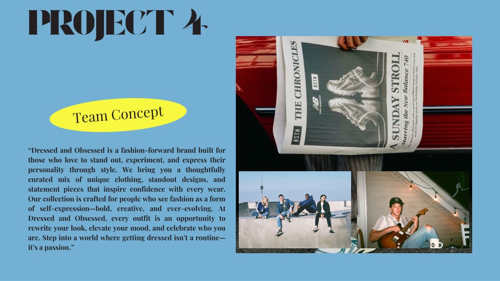 9. PROJECT 4 Team Concept “Dressed and Obsessed is a fashion-forward brand built for those who love to stand out, experiment, and express their personality through style. We bring you a thoughtfully curated mix of unique clothing, standout designs, and statement pieces that inspire confidence with every wear. Our collection is crafted for people who see fashion as a form of self-expression—bold, creative, and ever-evolving. At Dressed and Obsessed, every outfit is an opportunity to rewrite your look, elevate your mood, and celebrate who you are. Step into a world where getting dressed isn’t a routine—it’s a passion.”