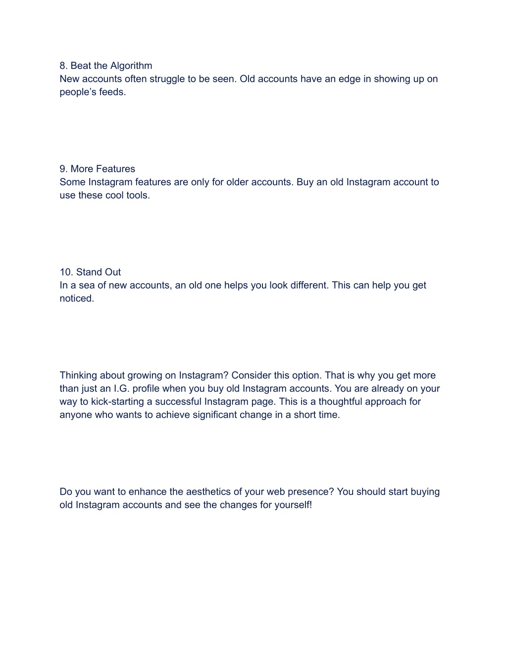 8. Beat the Algorithm New accounts often struggle to be seen. Old accounts have an edge in showing up on people’s feeds. 9. More Features Some Instagram features are only for older accounts. Buy an old Instagram account to use these cool tools. 10. Stand Out In a sea of new accounts, an old one helps you look different. This can help you get noticed. Thinking about growing on Instagram? Consider this option. That is why you get more than just an I.G. profile when you buy old Instagram accounts. You are already on your way to kick-starting a successful Instagram page. This is a thoughtful approach for anyone who wants to achieve significant change in a short time. Do you want to enhance the aesthetics of your web presence? You should start buying old Instagram accounts and see the changes for yourself!