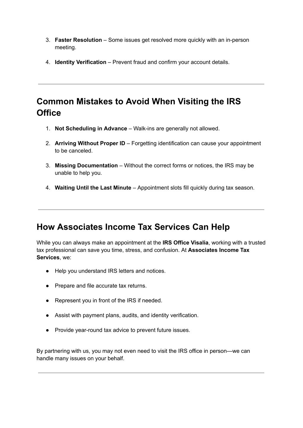 3. Faster Resolution – Some issues get resolved more quickly with an in-person meeting. 4. Identity Verification – Prevent fraud and confirm your account details. Common Mistakes to Avoid When Visiting the IRS Office 1. Not Scheduling in Advance – Walk-ins are generally not allowed. 2. Arriving Without Proper ID – Forgetting identification can cause your appointment to be canceled. 3. Missing Documentation – Without the correct forms or notices, the IRS may be unable to help you. 4. Waiting Until the Last Minute – Appointment slots fill quickly during tax season. How Associates Income Tax Services Can Help While you can always make an appointment at the IRS Office Visalia, working with a trusted tax professional can save you time, stress, and confusion. At Associates Income Tax Services, we: ● Help you understand IRS letters and notices. ● Prepare and file accurate tax returns. ● Represent you in front of the IRS if needed. ● Assist with payment plans, audits, and identity verification. ● Provide year-round tax advice to prevent future issues. By partnering with us, you may not even need to visit the IRS office in person—we can handle many issues on your behalf.