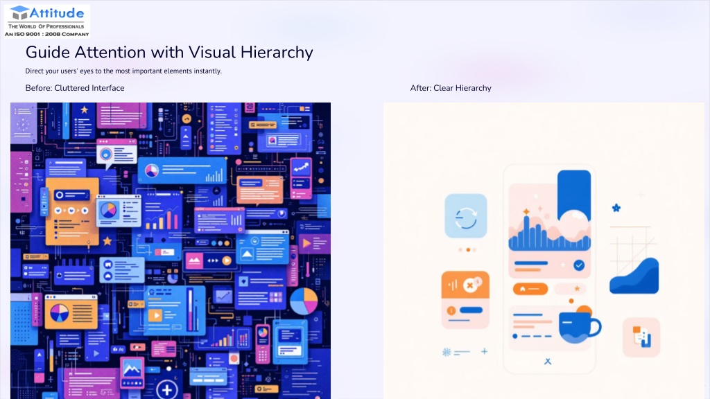 Guide Attention with Visual Hierarchy Direct your users' eyes to the most important elements instantly. Before: Cluttered Interface After: Clear Hierarchy preencoded.png
