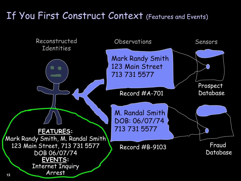 This is Context Construction (A Librarian Function) Observations Sensors Persistent Context Mark Randy Smith 123 Main Street 713 731 5577 Prospect Database Record #A-701 M. Randal Smith DOB: 06/07/74 713 731 5577 FEATURES: Mark Randy Smith, Randal Smith 123 Main Street 713 731 5577 DOB 06/07/74 Fraud Database Record #B-9103 Mark