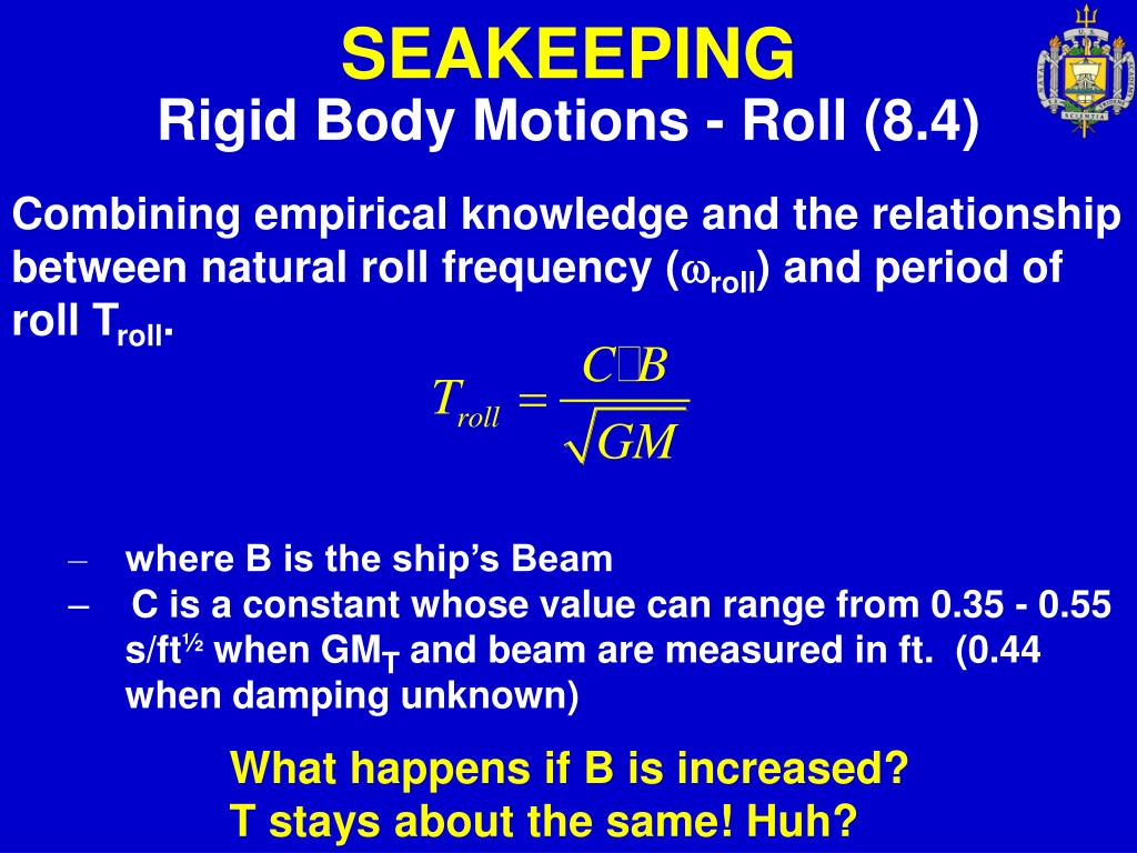 Rigid Body Motions - Roll (8.4) SEAKEEPING • Combining empirical knowledge and the relationship between natural roll frequency (roll) and period of roll Troll. • where B is the ship’s Beam • C is a constant whose value can range from 0.35 - 0.55 s/ft½ when GMT and beam are measured in ft. (0.44 when damping unknown) What happens if B is increased? T stays about the same! Huh?