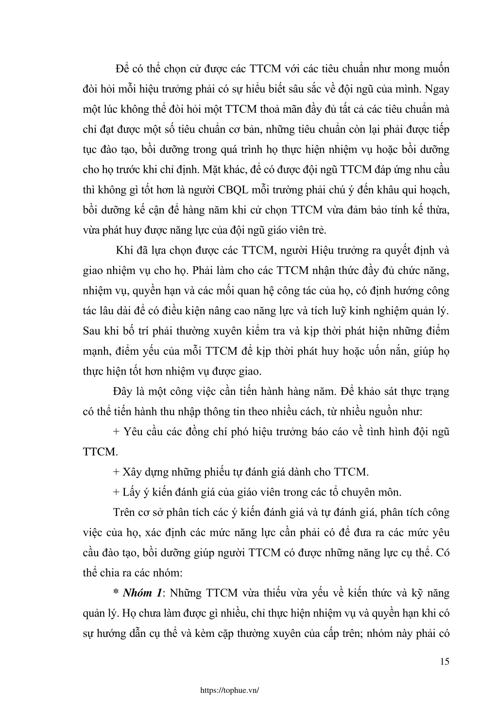Để có thể chọn cử được các TTCM với các tiêu chuẩn như mong muốn đòi hỏi mỗi hiệu trưởng phải có sự hiểu biết sâu sắc về đội ngũ của mình. Ngay một lúc không thể đòi hỏi một TTCM thoả mãn đầy đủ tất cả các tiêu chuẩn mà chỉ đạt được một số tiêu chuẩn cơ bản, những tiêu chuẩn còn lại phải được tiếp tục đào tạo, bồi dưỡng trong quá trình họ thực hiện nhiệm vụ hoặc bồi dưỡng cho họ trước khi chỉ định. Mặt khác, để có được đội ngũ TTCM đáp ứng nhu cầu thì không gì tốt hơn là người CBQL mỗi trường phải chú ý đến khâu qui hoạch, bồi dưỡng kế cận để hàng năm khi cử chọn TTCM vừa đảm bảo tính kế thừa, vừa phát huy được năng lực của đội ngũ giáo viên trẻ. Khi đã lựa chọn được các TTCM, người Hiệu trưởng ra quyết định và giao nhiệm vụ cho họ. Phải làm cho các TTCM nhận thức đầy đủ chức năng, nhiệm vụ, quyền hạn và các mối quan hệ công tác của họ, có định hướng công tác lâu dài để có điều kiện nâng cao năng lực và tích luỹ kinh nghiệm quản lý. Sau khi bố trí phải thường xuyên kiểm tra và kịp thời phát hiện những điểm mạnh, điểmyếu của mỗi TTCM để kịp thời phát huy hoặc uốn nắn, giúp họ thực hiện tốt hơn nhiệm vụ được giao. Đây là một công việc cần tiến hành hàng năm. Để khảo sát thực trạng có thể tiến hành thu nhập thông tin theo nhiều cách, từ nhiều nguồnnhư: + Yêu cầu các đồng chí phó hiệu trưởng báo cáo về tình hình đội ngũ TTCM. + Xây dựng những phiếu tự đánh giá dành cho TTCM. + Lấy ý kiến đánh giá của giáo viên trong các tổ chuyên môn. Trên cơ sở phân tích các ý kiến đánh giá và tự đánh giá, phân tích công việc của họ, xác định các mức năng lực cần phải có để đưa ra các mức yêu cầu đào tạo, bồi dưỡng giúp ngườiTTCM có được những năng lực cụ thể. Có thể chia ra các nhóm: * Nhóm 1: Những TTCM vừa thiếu vừa yếu về kiến thức và kỹ năng quản lý. Họ chưa làm được gì nhiều, chỉ thực hiện nhiệm vụ và quyền hạn khi có sự hướng dẫn cụ thể và kèm cặp thường xuyên của cấp trên; nhóm này phải có 15 https://tophue.vn/