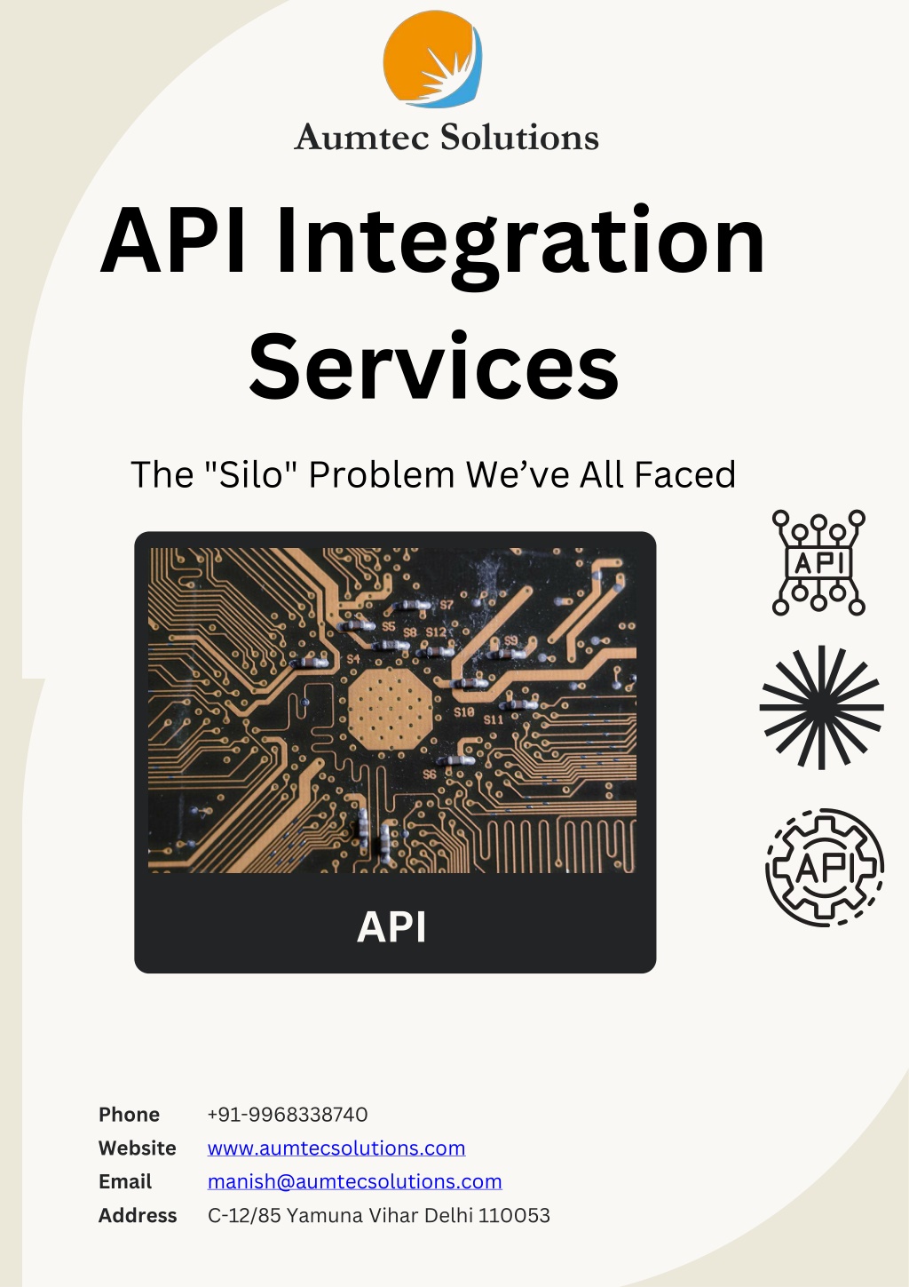 1. Aumtec Solutions • API Integration Services • The "Silo" Problem We’ve AllFaced • API Phone Website Email Address +91-9968338740 www.aumtecsolutions.com manish@aumtecsolutions.com C-12/85 Yamuna Vihar Delhi 110053