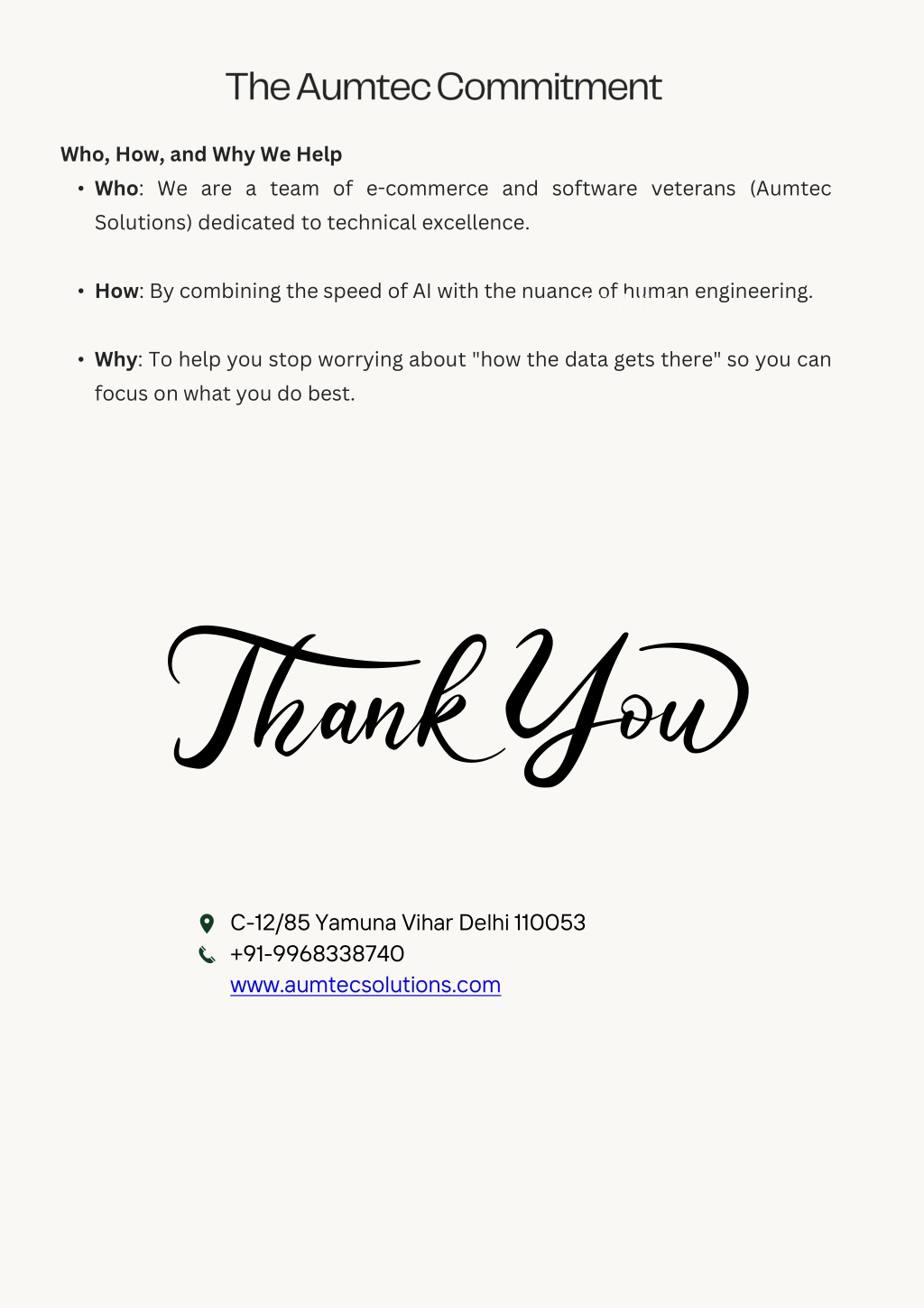 6. The Aumtec Commitment • Who, How, and Why We Help • Who: We are a team of e-commerce and software veterans (Aumtec Solutions) dedicated to technical excellence. • How: By combining the speed of AI with the nuance of human engineering. • Why: To help you stop worrying about "how the data gets there" so you can focus on what you do best. • Event Highlight C-12/85 Yamuna Vihar Delhi 110053 +91-9968338740 www.aumtecsolutions.com