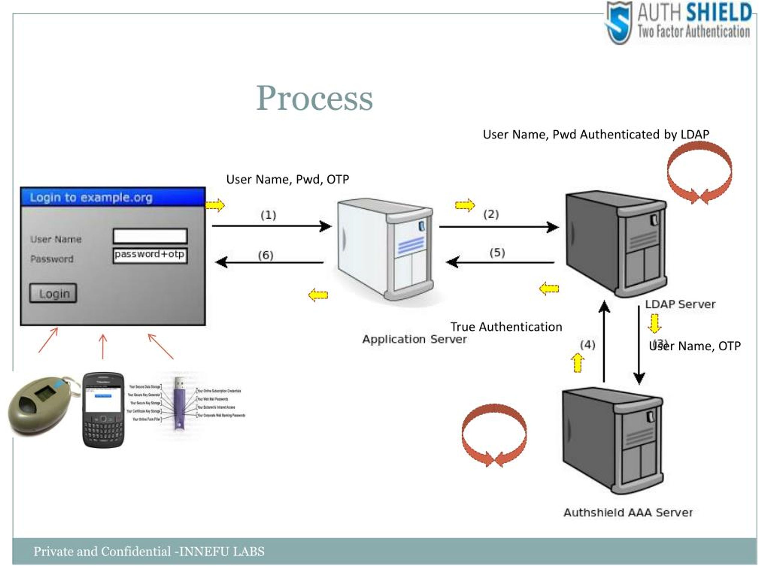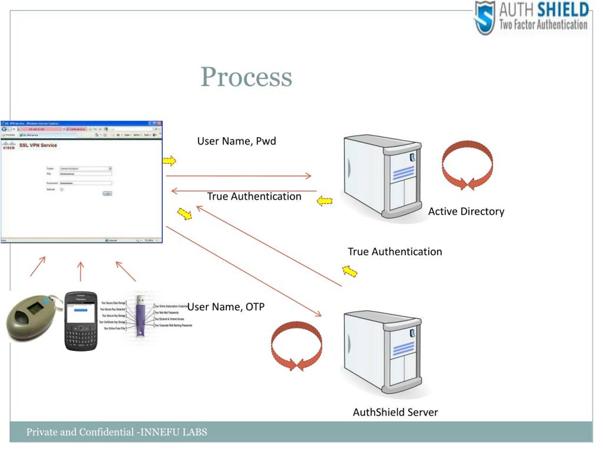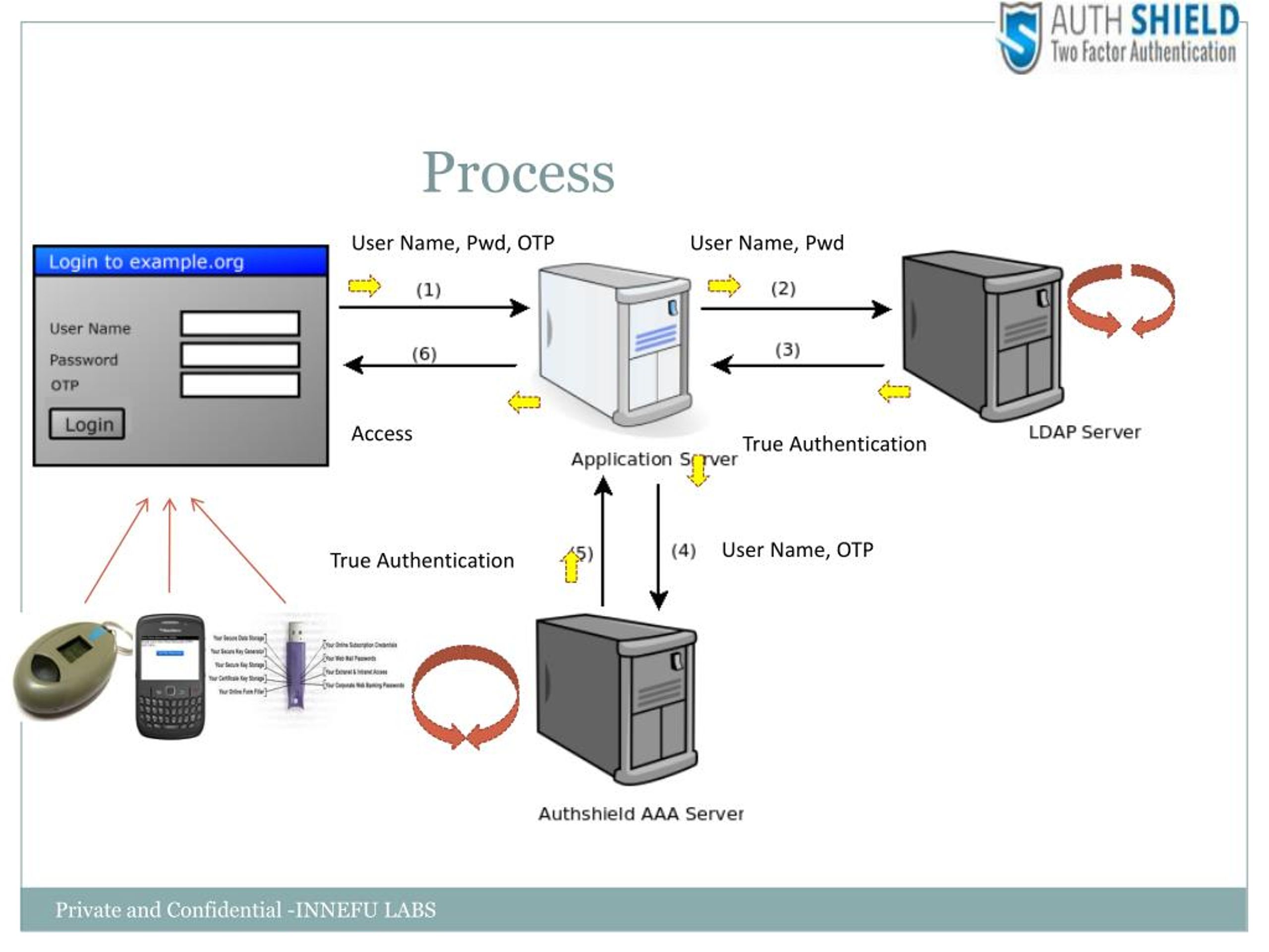 5. Process User Name, Pwd True Authentication Active Directory True Authentication User Name, OTP AuthShield Server Private and Confidential -INNEFU LABS