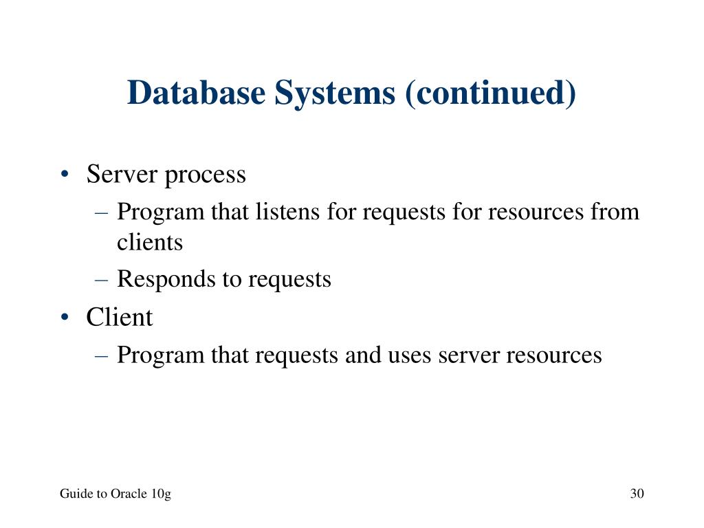 Database Systems (continued) • Server process • Program that listens for requests for resources from clients • Responds to requests • Client • Program that requests and uses server resources Guide to Oracle 10g