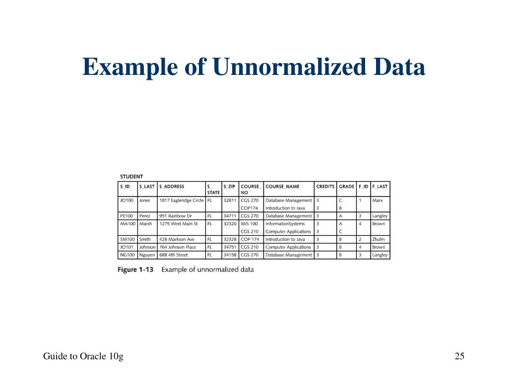 Normalization (continued) • Unnormalizeddata • Does not have a primary key identified • Contains repeating groups • First normal form (1NF) • Repeating groups removed • Primary key field identified Guide to Oracle 10g