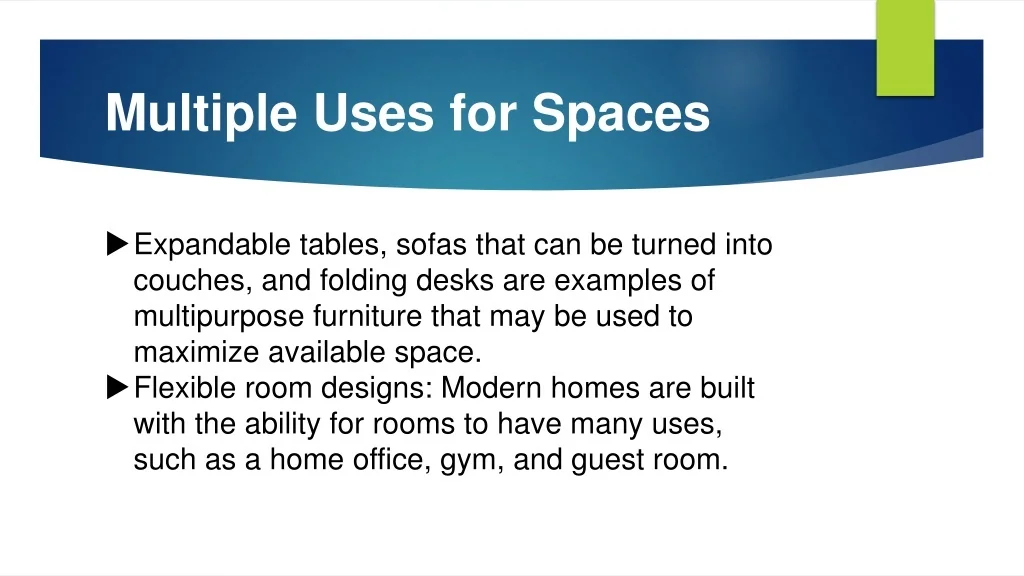 Multiple Uses for Spaces • Expandable tables, sofas that can be turned into couches, and folding desks are examples of multipurpose furniture that may be used to maximize available space. • Flexible room designs: Modern homes are built with the ability for rooms to have many uses, such as a home office, gym, and guest room.