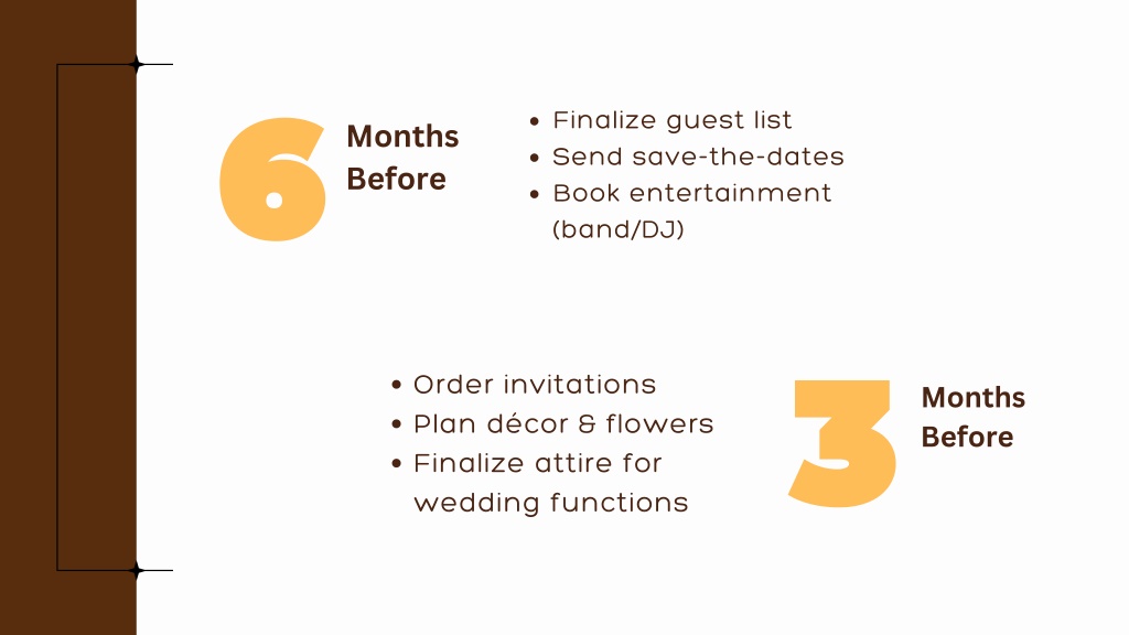3. Finalize guest list Send save-the-dates Book entertainment (band/DJ) Months Before Order invitations Plan décor & flowers Finalize attire for wedding functions Months Before