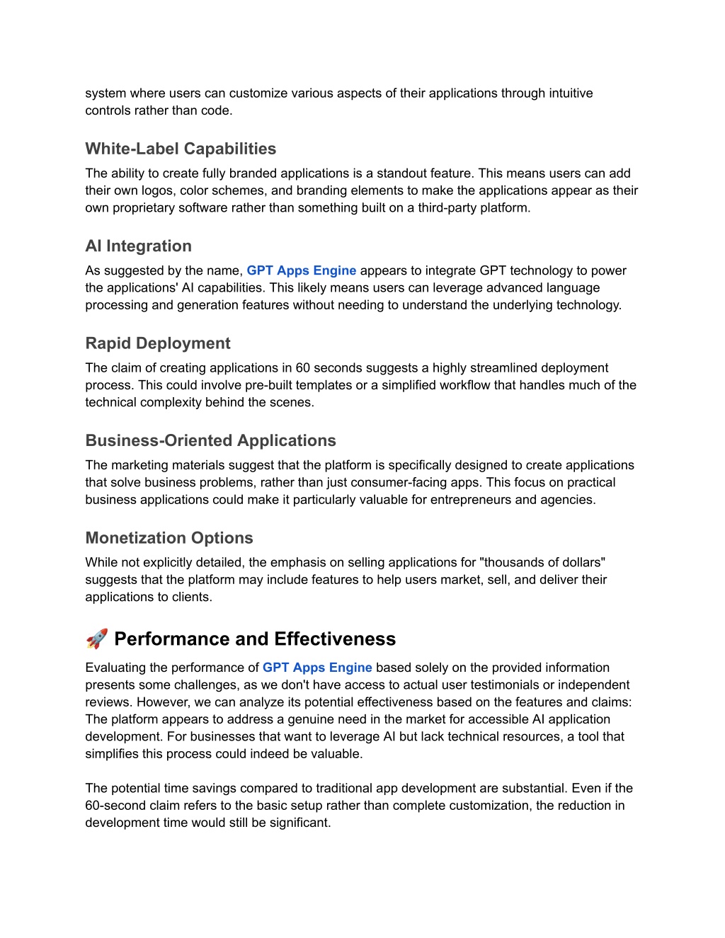 system where users can customize various aspects of their applications through intuitive controls rather than code. White-Label Capabilities The ability to create fully branded applications is a standout feature. This means users can add their own logos, color schemes, and branding elements to make the applications appear as their own proprietary software rather than something built on a third-party platform. AI Integration As suggested by the name, GPT Apps Engine appears to integrate GPT technology to power the applications' AI capabilities. This likely means users can leverage advanced language processing and generation features without needing to understand the underlying technology. Rapid Deployment The claim of creating applications in 60 seconds suggests a highly streamlined deployment process. This could involve pre-built templates or a simplified workflow that handles much of the technical complexity behind the scenes. Business-Oriented Applications The marketing materials suggest that the platform is specifically designed to create applications that solve business problems, rather than just consumer-facing apps. This focus on practical business applications could make it particularly valuable for entrepreneurs and agencies. Monetization Options While not explicitly detailed, the emphasis on selling applications for "thousands of dollars" suggests that the platform may include features to help users market, sell, and deliver their applications to clients. ? Performance and Effectiveness Evaluating the performance of GPT Apps Engine based solely on the provided information presents some challenges, as we don't have access to actual user testimonials or independent reviews. However, we can analyze its potential effectiveness based on the features and claims: The platform appears to address a genuine need in the market for accessible AI application development. For businesses that want to leverage AI but lack technical resources, a tool that simplifies this process could indeed be valuable. The potential time savings compared to traditional app development are substantial. Even if the 60-second claim refers to the basic setup rather than complete customization, the reduction in development time would still be significant.