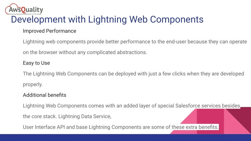 Development with Lightning Web Components Improved Performance Lightning web components provide better performance to the end-user because they can operate on the browser without any complicated abstractions. Easy to Use The Lightning Web Components can be deployed with just a few clicks when they are developed properly. Additional benefits Lightning Web Components comes with an added layer of special Salesforce services besides the core stack. Lightning Data Service, User Interface API and base Lightning Components are some of these extra benefits.