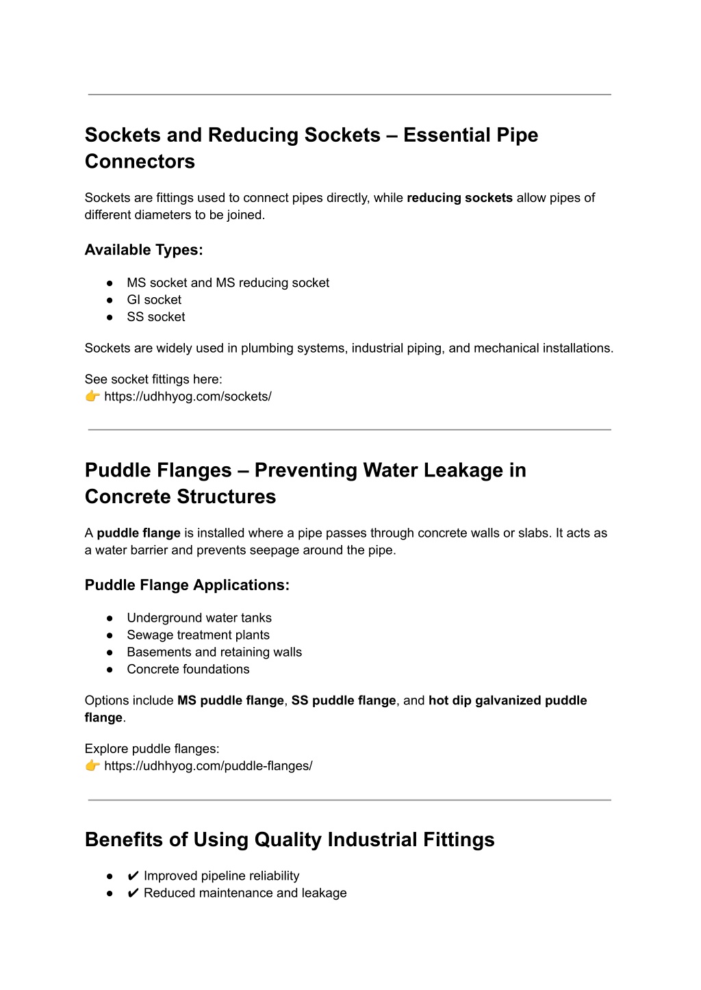 Sockets and Reducing Sockets – Essential Pipe Connectors Sockets are fittings used to connect pipes directly, while reducing sockets allow pipes of different diameters to be joined. Available Types: ● MS socket and MS reducing socket ● GI socket ● SS socket Sockets are widely used in plumbing systems, industrial piping, and mechanical installations. See socket fittings here: ? https://udhhyog.com/sockets/ Puddle Flanges – Preventing Water Leakage in Concrete Structures A puddle flange is installed where a pipe passes through concrete walls or slabs. It acts as a water barrier and prevents seepage around the pipe. Puddle Flange Applications: ● Underground water tanks ● Sewage treatment plants ● Basements and retaining walls ● Concrete foundations Options include MS puddle flange, SS puddle flange, and hot dip galvanized puddle flange. Explore puddle flanges: ? https://udhhyog.com/puddle-flanges/ Benefits of Using Quality Industrial Fittings ● ✔ Improved pipeline reliability ● ✔ Reduced maintenance and leakage