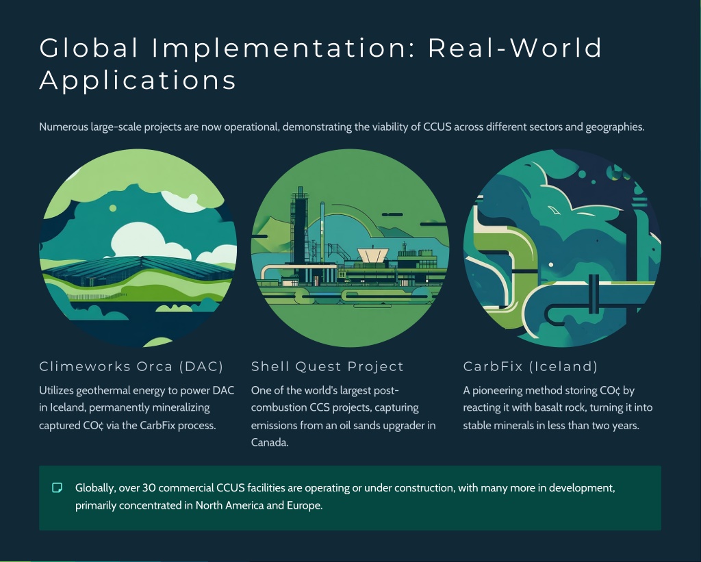 Global Implementation: Real-World Applications Numerouslarge-scaleprojectsarenowoperational,demonstratingtheviabilityofCCUSacrossdifferentsectorsandgeographies. ClimeworksOrca(DAC) ShellQuestProject CarbFix(Iceland) Utilizes geothermal energy to power DAC in Iceland, permanently mineralizing captured CO¢ via the CarbFix process. One of the world's largest post- combustion CCS projects, capturing emissions from an oil sands upgrader in Canada. A pioneering method storing CO¢ by reacting it with basalt rock, turning it into stable minerals in less than two years. Globally, over 30 commercial CCUS facilities are operating or under construction, with many more in development, primarily concentrated in North America and Europe.