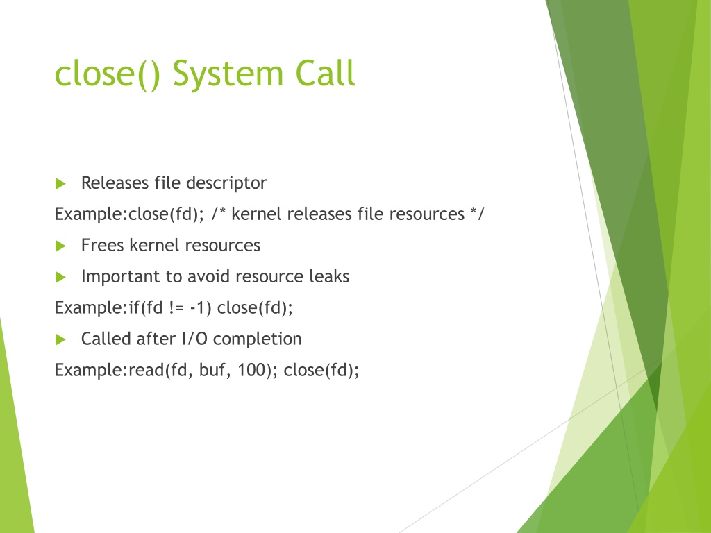 15. close() System Call • Releases file descriptor Example:close(fd); /* kernel releases file resources */ • Frees kernel resources • Important to avoid resource leaks Example:if(fd != -1) close(fd); • Called after I/O completion Example:read(fd, buf, 100); close(fd);