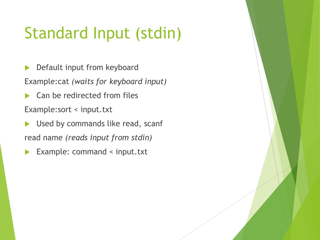8. Standard Input (stdin) • Default input from keyboard Example:cat(waits for keyboard input) • Can be redirected from files Example:sort < input.txt • Used by commands like read, scanf read name (reads input from stdin) • Example: command < input.txt