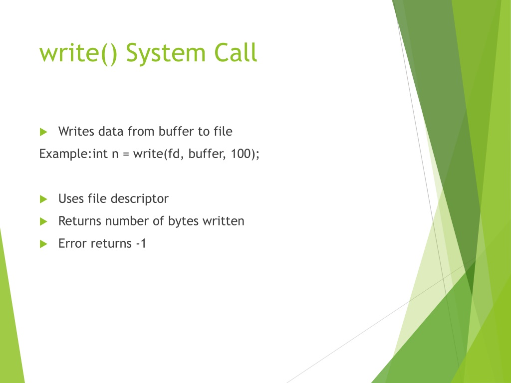 14. write() System Call • Writes data from buffer to file Example:int n = write(fd, buffer, 100); • Uses file descriptor • Returns number of bytes written • Error returns -1