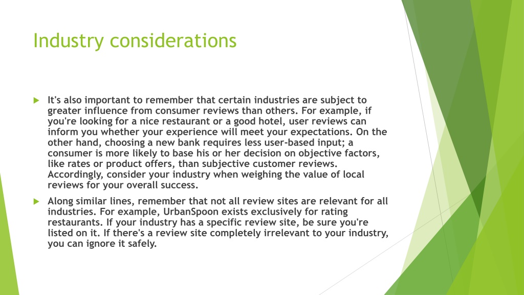 Industry considerations • It's also important to remember that certain industries are subject to greater influence from consumer reviews than others. For example, if you're looking for a nice restaurant or a good hotel, user reviews can inform you whether your experience will meet your expectations. On the other hand, choosing a new bank requires less user-based input; a consumer is more likely to base his or her decision on objective factors, like rates or product offers, than subjective customer reviews. Accordingly, consider your industry when weighing the value of local reviews for your overall success. • Along similar lines, remember that not all review sites are relevant for all industries. For example, UrbanSpoon exists exclusively for rating restaurants. If your industry has a specific review site, be sure you're listed on it. If there's a review site completely irrelevant to your industry, you can ignore it safely.