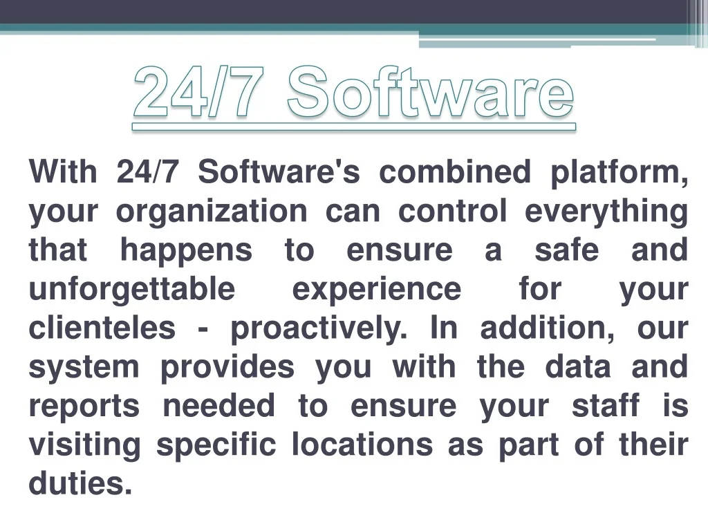 24/7 Software With 24/7 Software's combined platform, your organization can control everything that happens to ensure a safe and unforgettable experience for your clienteles - proactively. In addition, our system provides you with the data and reports needed to ensure your staff is visiting specific locations as part of their duties.