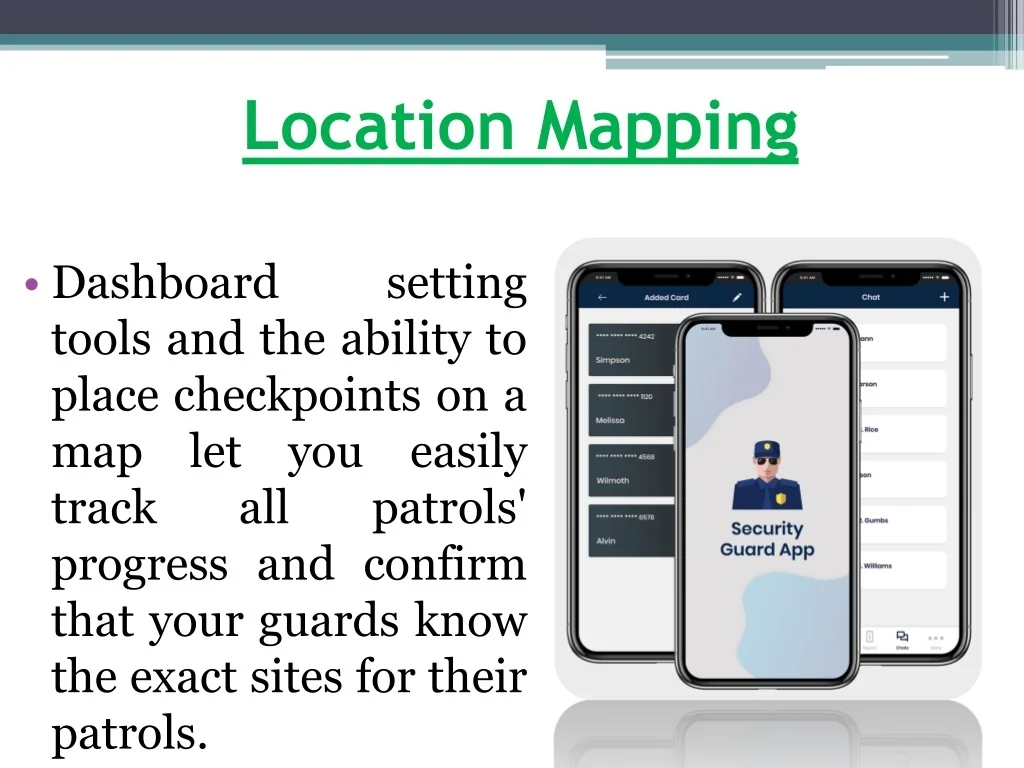 Location Mapping • Dashboard setting tools and the ability to place checkpoints on a map let you easily track all patrols' progress and confirm that your guards know the exact sites for their patrols.