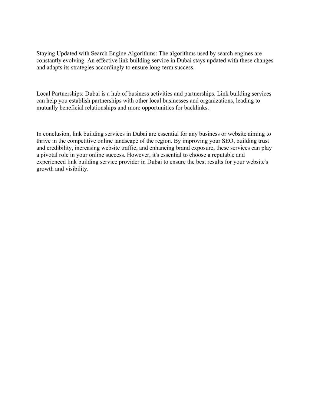 Staying Updated with Search Engine Algorithms: The algorithms used by search engines are constantly evolving. An effective link building service in Dubai stays updated with these changes and adapts its strategies accordingly to ensure long-term success. Local Partnerships: Dubai is a hub of business activities and partnerships. Link building services can help you establish partnerships with other local businesses and organizations, leading to mutually beneficial relationships and more opportunities for backlinks. In conclusion, link building services in Dubai are essential for any business or website aiming to thrive in the competitive online landscape of the region. By improving your SEO, building trust and credibility, increasing website traffic, and enhancing brand exposure, these services can play a pivotal role in your online success. However, it's essential to choose a reputable and experienced link building service provider in Dubai to ensure the best results for your website's growth and visibility.