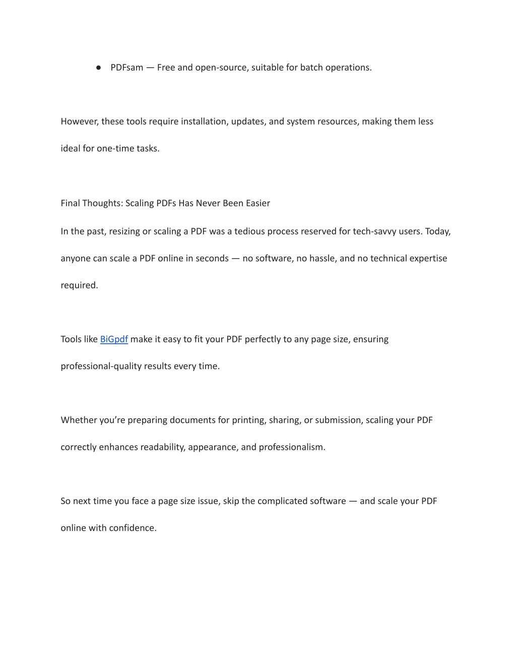 2. Preview Before Downloading Many online tools offer a preview mode — use it to ensure that nothing gets cut off or misaligned. 3. Avoid Over-Compression Some scaling tools also reduce file size, which can cause image quality loss. Choose tools that let you preserve original resolution. 4. Use Standard Page Sizes Stick with popular formats like A4, Letter, or Legal unless your project requires custom dimensions. 5. Check Print Settings If printing is your goal, verify that your printer settings match the new PDF size. Why Choose BiGpdf for Scaling PDFs Online Among the many online tools available, BiGpdf stands out for its user-friendly interface, reliable performance, and strong privacy measures. Key Benefits Include: