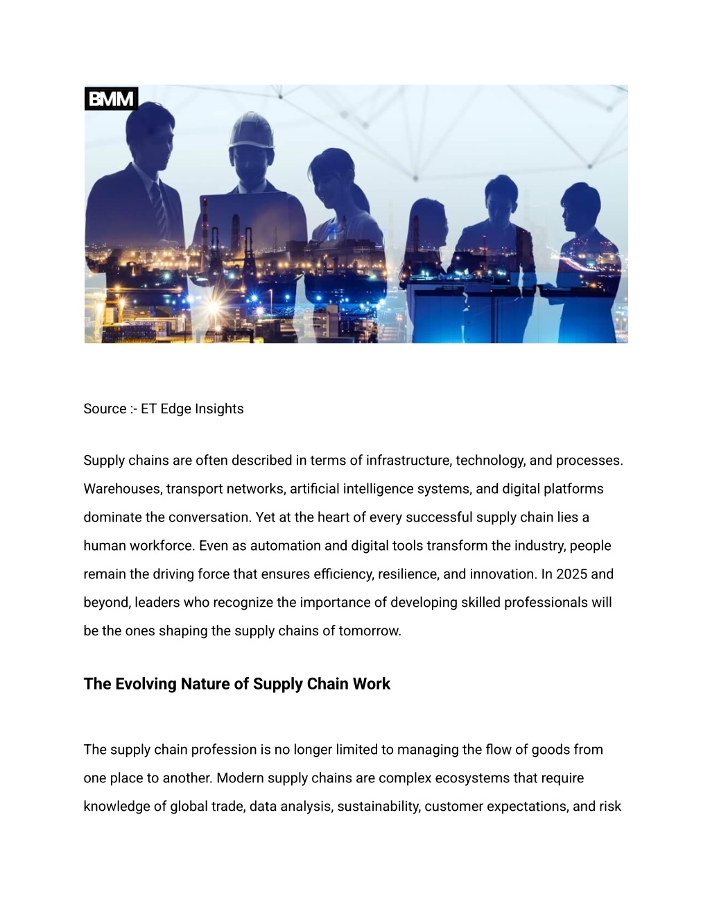 Source :- ET Edge Insights Supply chains are often described in terms of infrastructure, technology, and processes. Warehouses, transport networks, artificial intelligence systems, and digital platforms dominate the conversation. Yet at the heart of every successful supply chain lies a human workforce. Even as automation and digital tools transform the industry, people remain the driving force that ensures efficiency, resilience, and innovation. In 2025 and beyond, leaders who recognize the importance of developing skilled professionals will be the ones shaping the supply chains of tomorrow. The Evolving Nature of Supply Chain Work The supply chain profession is no longer limited to managing the flow of goods from one place to another. Modern supply chains are complex ecosystems that require knowledge of global trade, data analysis, sustainability, customer expectations, and risk