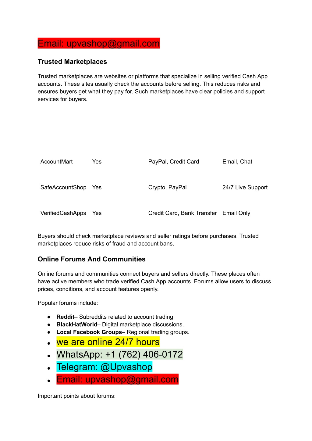 Email: upvashop@gmail.com Trusted Marketplaces Trusted marketplaces are websites or platforms that specialize in selling verified Cash App accounts. These sites usually check the accounts before selling. This reduces risks and ensures buyers get what they pay for. Such marketplaces have clear policies and support services for buyers. AccountMart Yes PayPal, Credit Card Email, Chat SafeAccountShop Yes Crypto, PayPal 24/7 Live Support VerifiedCashApps Yes Credit Card, Bank Transfer Email Only Buyers should check marketplace reviews and seller ratings before purchases. Trusted marketplaces reduce risks of fraud and account bans. Online Forums And Communities Online forums and communities connect buyers and sellers directly. These places often have active members who trade verified Cash App accounts. Forums allow users to discuss prices, conditions, and account features openly. Popular forums include: ● Reddit– Subreddits related to account trading. ● BlackHatWorld– Digital marketplace discussions. ● Local Facebook Groups– Regional trading groups. ● we are online 24/7 hours ● WhatsApp: +1 (762) 406-0172 ● Telegram: @Upvashop ● Email: upvashop@gmail.com Important points about forums: