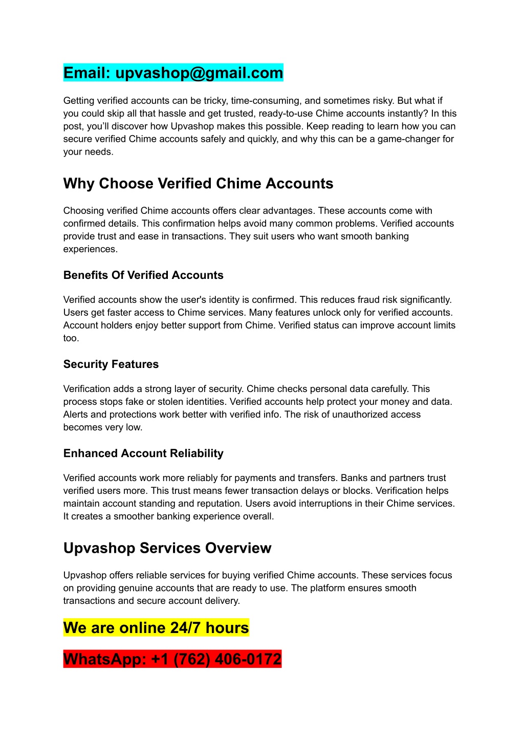 Email: upvashop@gmail.com Getting verified accounts can be tricky, time-consuming, and sometimes risky. But what if you could skip all that hassle and get trusted, ready-to-use Chime accounts instantly? In this post, you’ll discover how Upvashop makes this possible. Keep reading to learn how you can secure verified Chime accounts safely and quickly, and why this can be a game-changer for your needs. Why Choose Verified Chime Accounts Choosing verified Chime accounts offers clear advantages. These accounts come with confirmed details. This confirmation helps avoid many common problems. Verified accounts provide trust and ease in transactions. They suit users who want smooth banking experiences. Benefits Of Verified Accounts Verified accounts show the user's identity is confirmed. This reduces fraud risk significantly. Users get faster access to Chime services. Many features unlock only for verified accounts. Account holders enjoy better support from Chime. Verified status can improve account limits too. Security Features Verification adds a strong layer of security. Chime checks personal data carefully. This process stops fake or stolen identities. Verified accounts help protect your money and data. Alerts and protections work better with verified info. The risk of unauthorized access becomes very low. Enhanced Account Reliability Verified accounts work more reliably for payments and transfers. Banks and partners trust verified users more. This trust means fewer transaction delays or blocks. Verification helps maintain account standing and reputation. Users avoid interruptions in their Chime services. It creates a smoother banking experience overall. Upvashop Services Overview Upvashop offers reliable services for buying verified Chime accounts. These services focus on providing genuine accounts that are ready to use. The platform ensures smooth transactions and secure account delivery. We are online 24/7 hours WhatsApp: +1 (762) 406-0172
