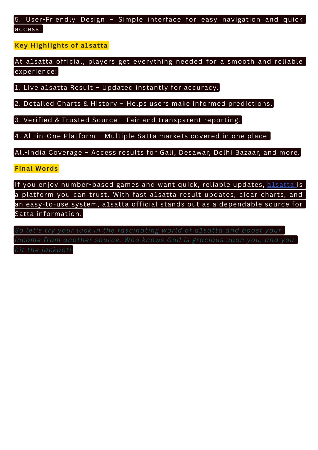 5. User-Friendly Design – Simple interface for easy navigation and quick access. Key Highlights of a1satta At a1satta official, players get everything needed for a smooth and reliable experience: 1. Live a1satta Result – Updated instantly for accuracy. 2. Detailed Charts & History – Helps users make informed predictions. 3. Verified & Trusted Source – Fair and transparent reporting. 4. All-in-One Platform – Multiple Satta markets covered in one place. All-India Coverage – Access results for Gali, Desawar, Delhi Bazaar, and more. Final Words If you enjoy number-based games and want quick, reliable updates, a1satta is a platform you can trust. With fast a1satta result updates, clear charts, and an easy-to-use system, a1satta official stands out as a dependable source for Satta information. So let's try your luck in the fascinating world of a1satta and boost your income from another source. Who knows God is gracious upon you, and you hit the jackpot!