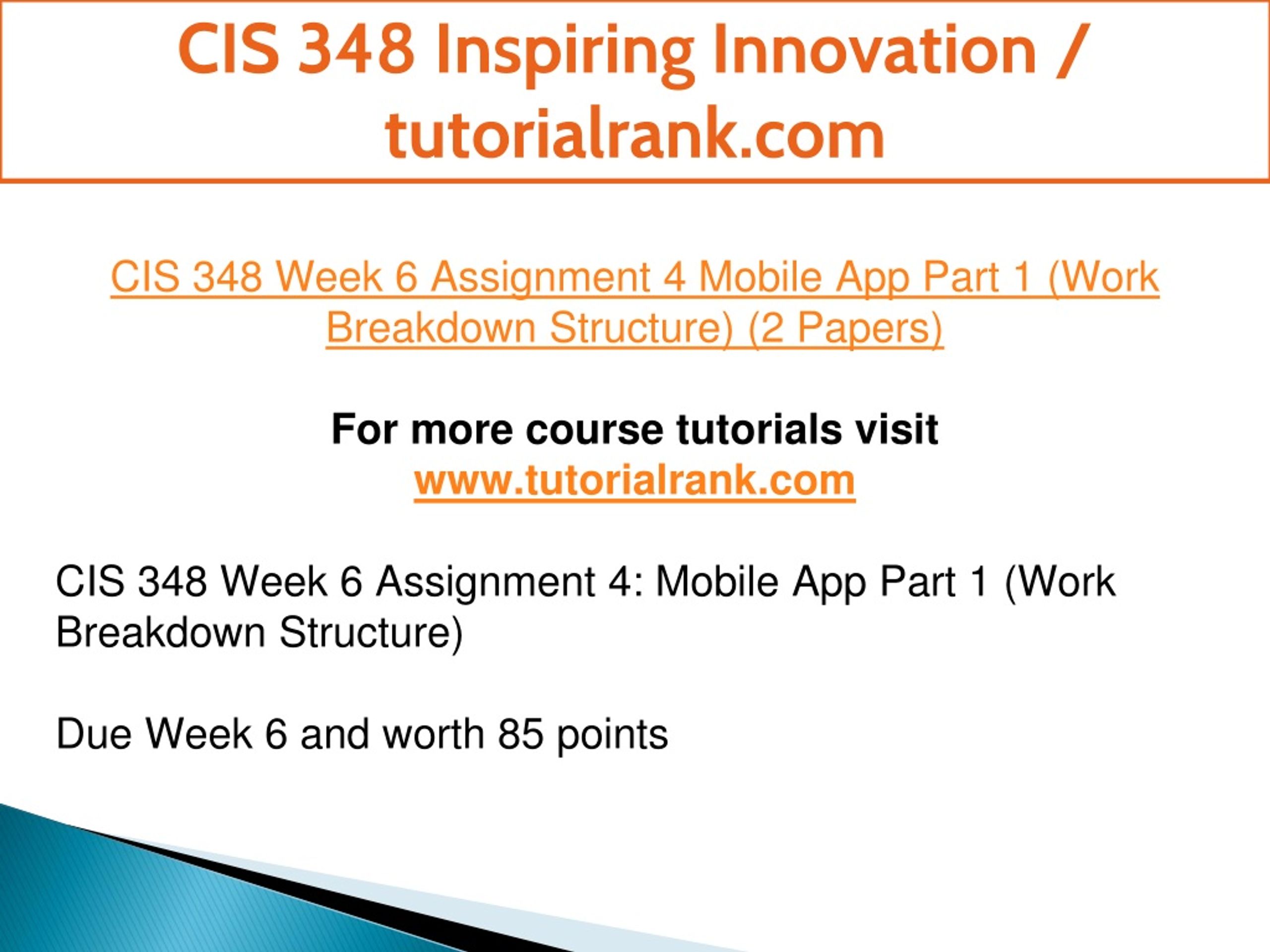 CIS 348 Inspiring Innovation / tutorialrank.com • CIS 348 Week 6 Assignment 4 Mobile App Part 1 (Work Breakdown Structure) (2 Papers) • For more course tutorials visit • www.tutorialrank.com • CIS 348 Week 6 Assignment 4: Mobile App Part 1 (Work Breakdown Structure) • Due Week 6 and worth 85 points