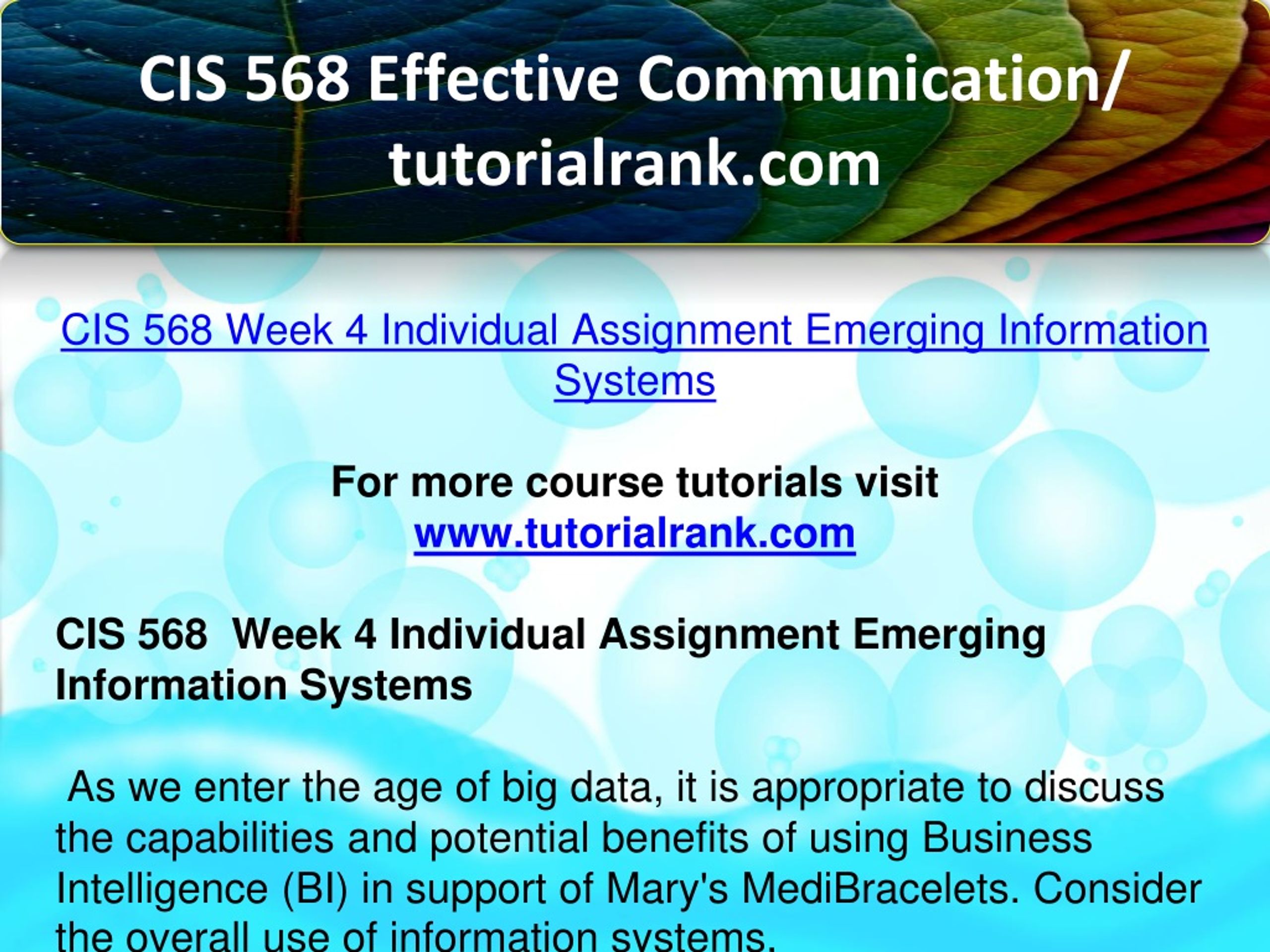 CIS 568 Effective Communication/ tutorialrank.com CIS 568 Week 4 Individual Assignment Emerging Information Systems For more course tutorials visit www.tutorialrank.com CIS 568 Week 4 Individual Assignment Emerging Information Systems As we enter the age of big data, it is appropriate to discuss the capabilities and potential benefits of using Business Intelligence (BI) in support of Mary's MediBracelets. Consider the overall use of information systems,