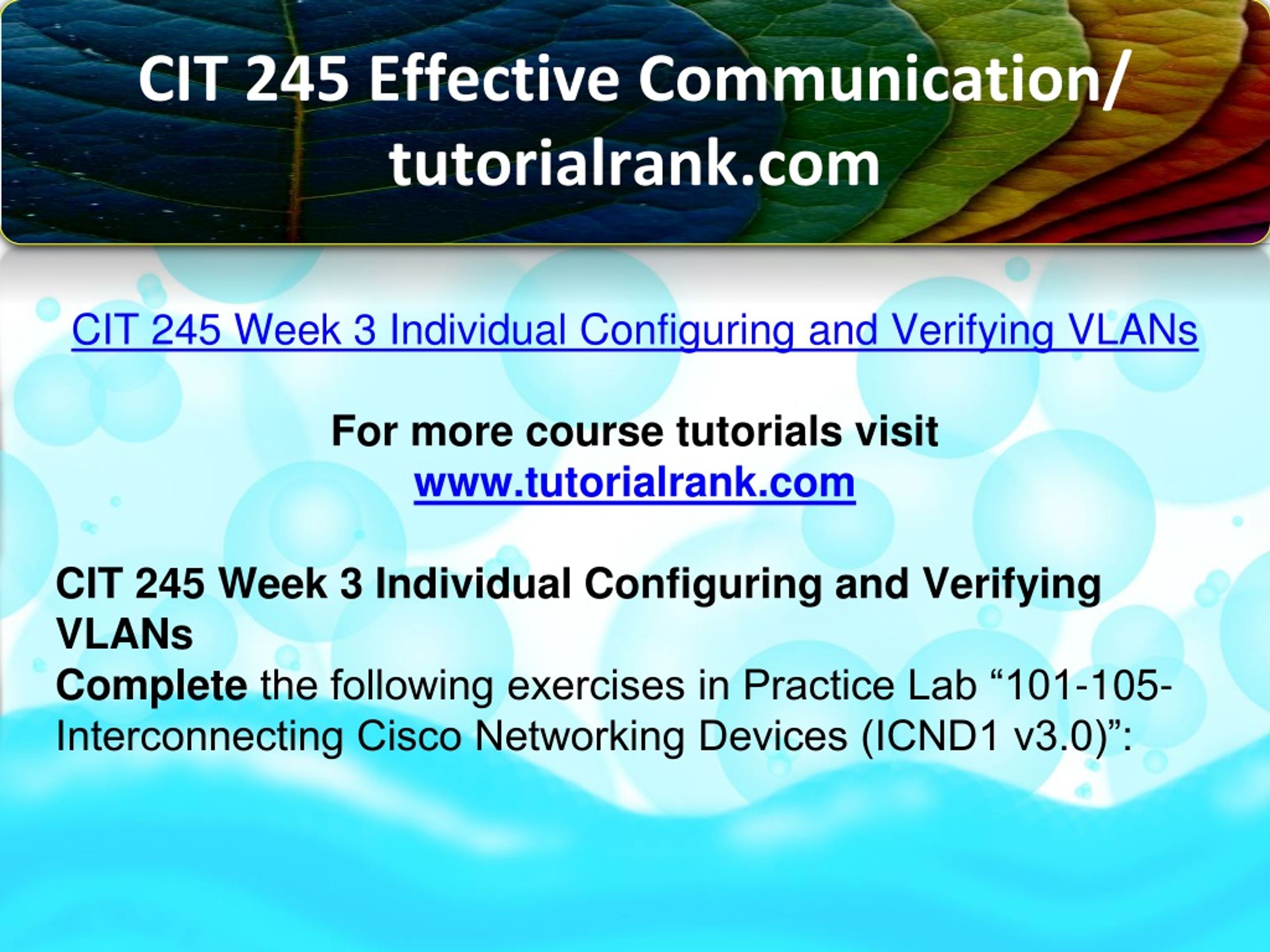 CIT 245 Effective Communication/ tutorialrank.com CIT 245 Week 3 Individual Configuring and Verifying VLANs For more course tutorials visit www.tutorialrank.com CIT 245 Week 3 Individual Configuring and Verifying VLANs Complete the following exercises in Practice Lab “101-105- Interconnecting Cisco Networking Devices (ICND1 v3.0)”: