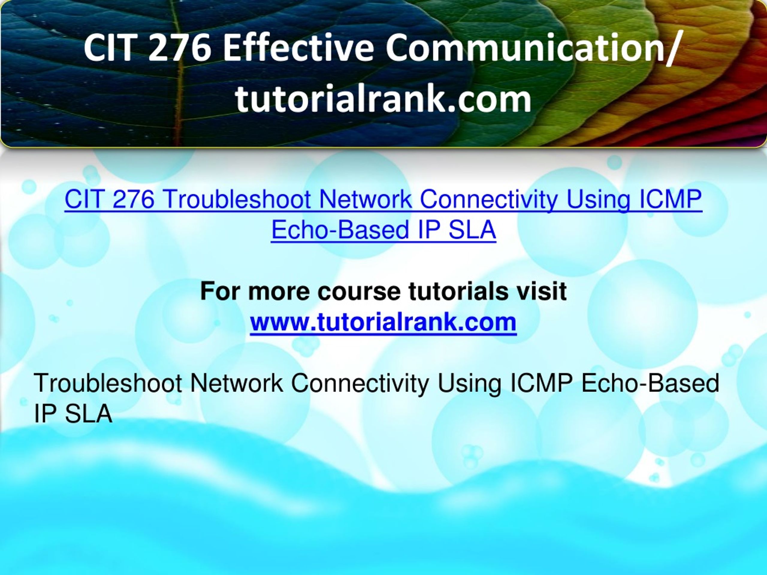 CIT 276 Effective Communication/ tutorialrank.com CIT 276 Troubleshoot Network Connectivity Using ICMP Echo-Based IP SLA For more course tutorials visit www.tutorialrank.com Troubleshoot Network Connectivity Using ICMP Echo-Based IP SLA